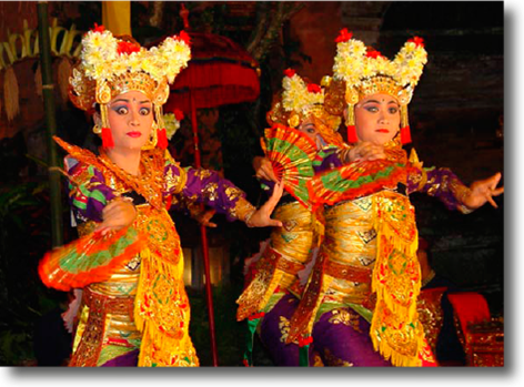 ๔. นาฏศิลป์บาหลี การร่ายรำเพื่อบวงสรวงและ การแต่งกาย ผู้หญิง นุ่งผ้าถุงพันตัว ตัวเอกจะพันผ้าถุงชายยาว จากพื้นปัดไปด้านหลัง มีเครื่องประดับศีรษะลวดลายทอง หรือกระบังหน้า ถ้าเป็นการแสดงพื้นบ้านก็จะเกล้าผมมวยต่ำประดับด้วยดอกลั่นทม