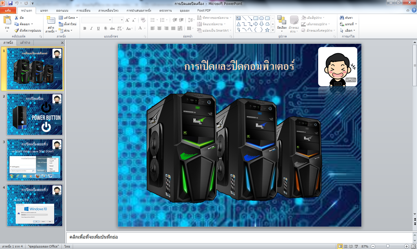 - ตรวจสอบปลั๊กไฟฟ้าหรือเปิดสวิทต์สำหรับไฟฟ้าที่มีระบบป้องกันอยู่ - เปิดเครื่องที่ปุ่ม Power ที่ตัว ซีพียู หรือปุ่มที่มีสัญลักษณ์นี้ ครูสอนทักษะการปิดเครื่องดังนี้ - เลื่อนเมาส์มาให้ตรงกับปุ่มคำว่า Start แล้วคลิกเมาส์ด้านซ้าย - เลือกคำสั่ง Shut Down หมายถึง คำสั่งที่ต้องการเลิกการทำงาน - ตรวจสอบคำสั่งที่เลือกอีกครั้งว่าเป็น Shut Down หรือไม่ ถ้าไม่ต้องเปลี่ยน เป็น Shut Down ก่อน แล้วคลิกที่ปุ่ม OK