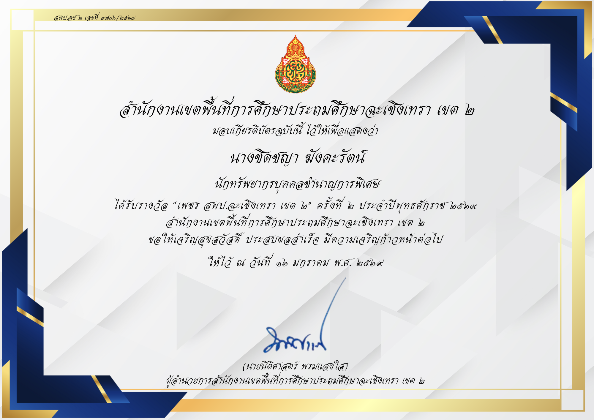 | 4 | นางชิดชญา ฆังคะรัตน์ | บุคลากรทางการศึกษา 38 ค (2) | สำนักงานเขตพื้นที่การศึกษาประถมศึกษาฉะเชิงเทรา เขต 2 | รางวัลเพรช สพป.ฉะเชิงเทรา เขต 2 ครั้งที่ 2 ประจำปี 2569 | อื่นๆ | เขตพื้นที่การศึกษา | 2026-01-16 | สำนักงานเขตพื้นที่การศึกษาประถมศึกษาฉะเชิงเทรา เขต 2 | เปิดไฟล์ |