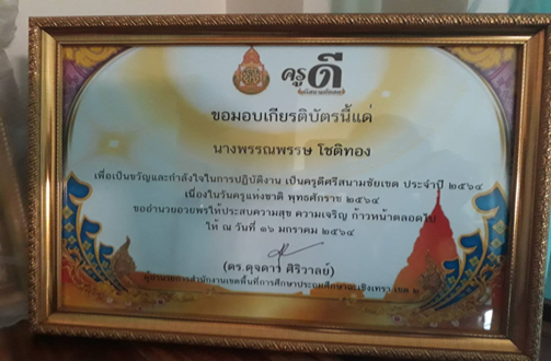 | 12 | นางสาวดวงพร สุขสำราญ | ผู้บริหารสถานศึกษา | บ้านอ่างทอง | ครูดีไม่มีอบายมุข ประจำปีการศึกษา 2563 เนื่องในวันครูแห่งชาติ พุทธศักราช 2564 | อื่นๆ | ชาติ | 2564-01-16 | สำนักงานคณะกรรมการการศึกษาขั้นพื้นฐาน | เปิดไฟล์ |