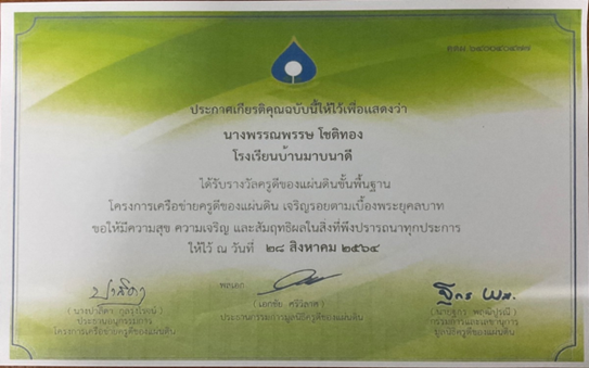 | 15 | นางนรีรัตน์ คล้ายสุวรรณ์ | ผู้บริหารสถานศึกษา | บ้านโป่งเจริญ | รางวัลผู้บริหารสถานศึกษาดีของแผ่นดินขั้นพื้นฐาน | อื่นๆ | ชาติ | 2021-10-30 | มูลนิธิครูดีของแผ่นดิน | เปิดไฟล์ |