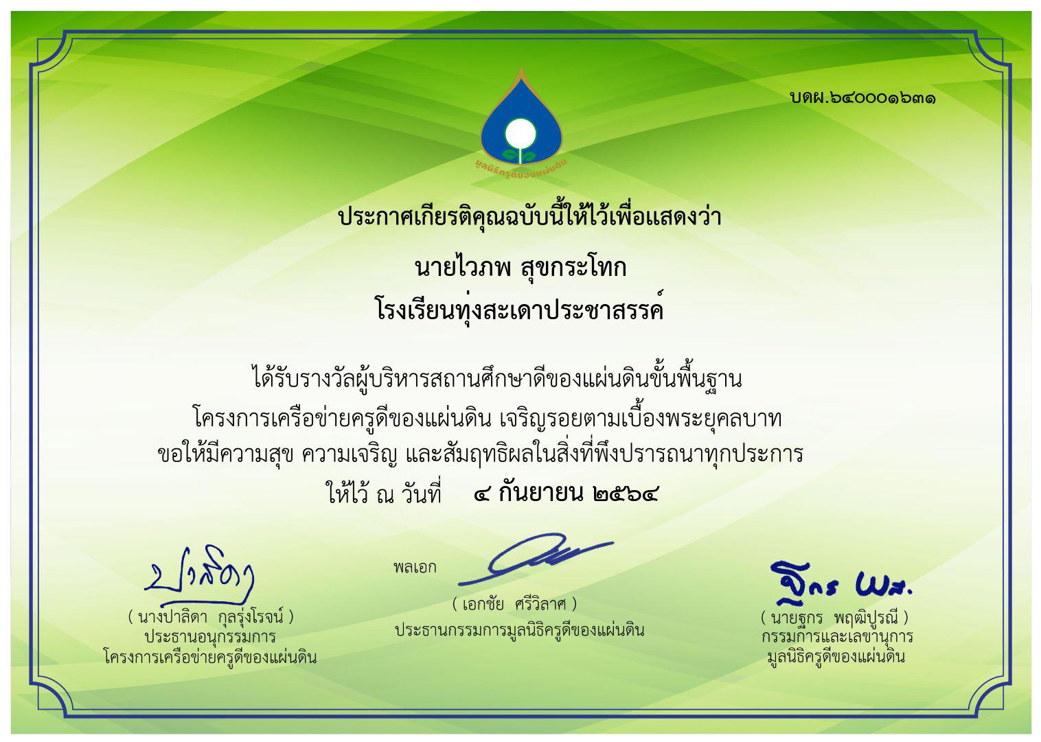 | 19 | นายไวภพ สุขกระโทก | ผู้บริหารสถานศึกษา | ทุ่งสะเดาประชาสรรค์ | ผู้บริหารสถานศึกษาดีของแผ่นดินขั้นพื้นฐาน | อื่นๆ | เขตพื้นที่การศึกษา | 2021-09-04 | มูลนิธิครูดีของแผ่นดิน | เปิดไฟล์ |
