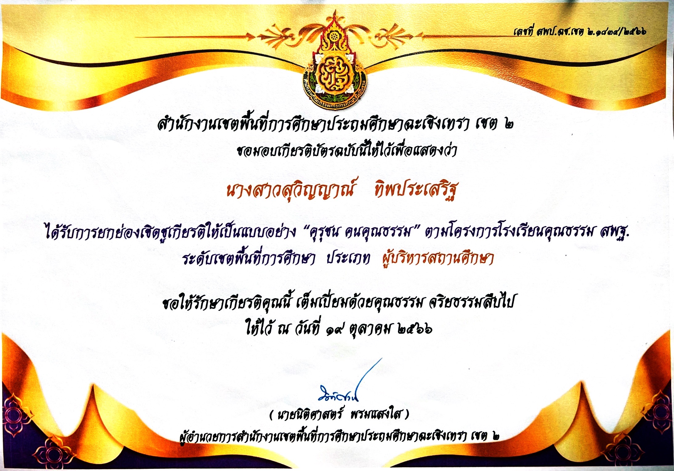 | 38 | นางปริญญาภรณ์ บุษบากร | ผู้บริหารสถานศึกษา | บ้านศรีเจริญทอง | ผู้อำนวยการสถานศึกษาดีเด่น | อื่นๆ | จังหวัด | 2023-09-29 | ศึกษาธิการจังหวัด | เปิดไฟล์ |