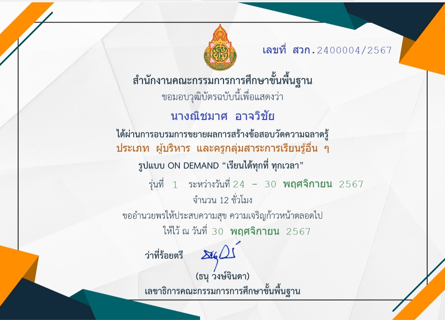 | 27 | นางณิชมาศ อาจวิชัย | ผู้บริหารสถานศึกษา | บ้านกรอกสะแก | ได้ผ่านการอบรมการขยายผลการสร้างข้อสอบวัดความฉลาดรู้ประเภทผู้บริหารและการเรียนรู้อื่นๆรูปแบบ ON Demand " เรียนได้ทุกที่ ทุกเวลา" | อื่นๆ | ภาค | 2024-11-30 | สำนักงานคณะกรรมการการศึกษาขั้นพื้นฐาน | เปิดไฟล์ |