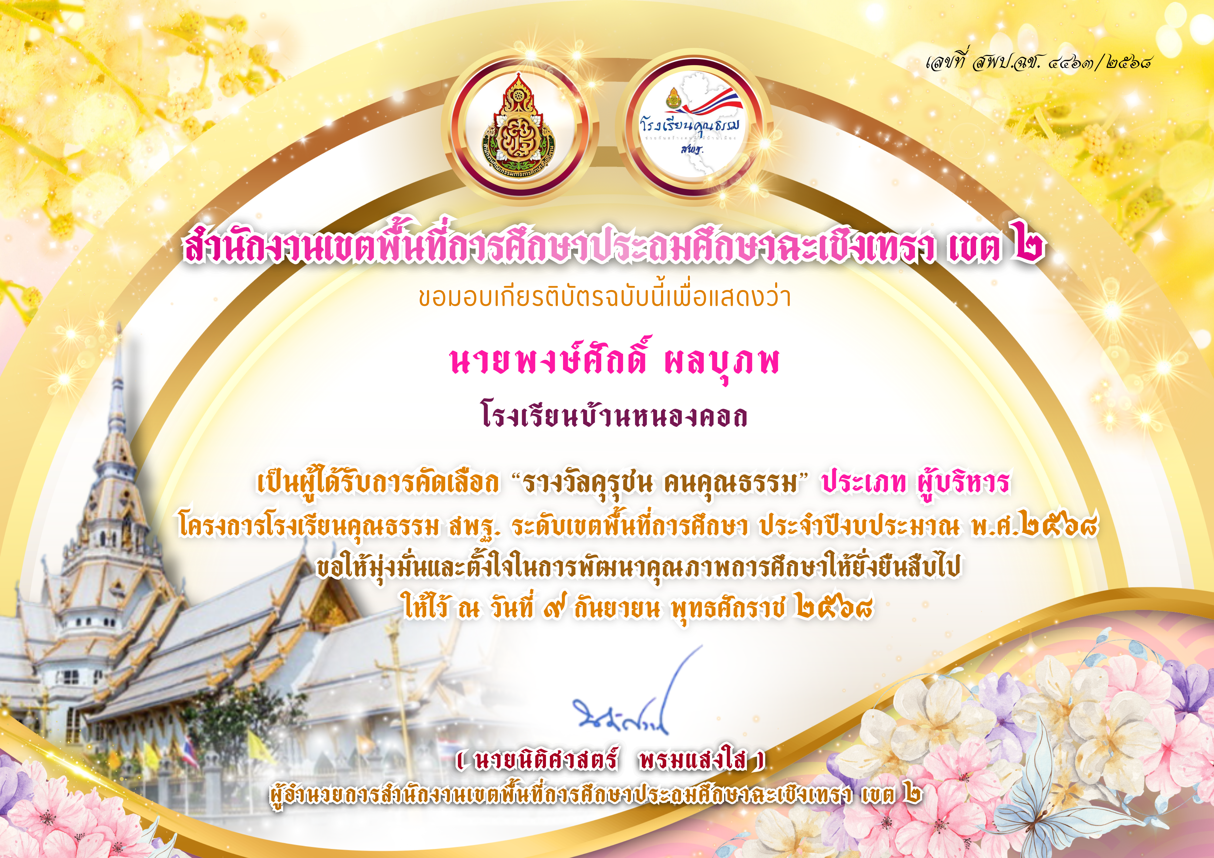 | 33 | นางนรีรัตน์ คล้ายสุวรรณ์ | ผู้บริหารสถานศึกษา | บ้านโป่งเจริญ | คุรุชน คนคุณธรรม ประเภทผู้บริหาร โครงการโรงเรียนคุณธรรม สพฐ. ประจำปีงบประมาณ พ.ศ. 2568 | อื่นๆ | เขตพื้นที่การศึกษา | 2025-09-09 | สำนักงานเขตพื้นที่การศึกษาประถมศึกษาฉะเชิงเทรา เขต 2 | เปิดไฟล์ |