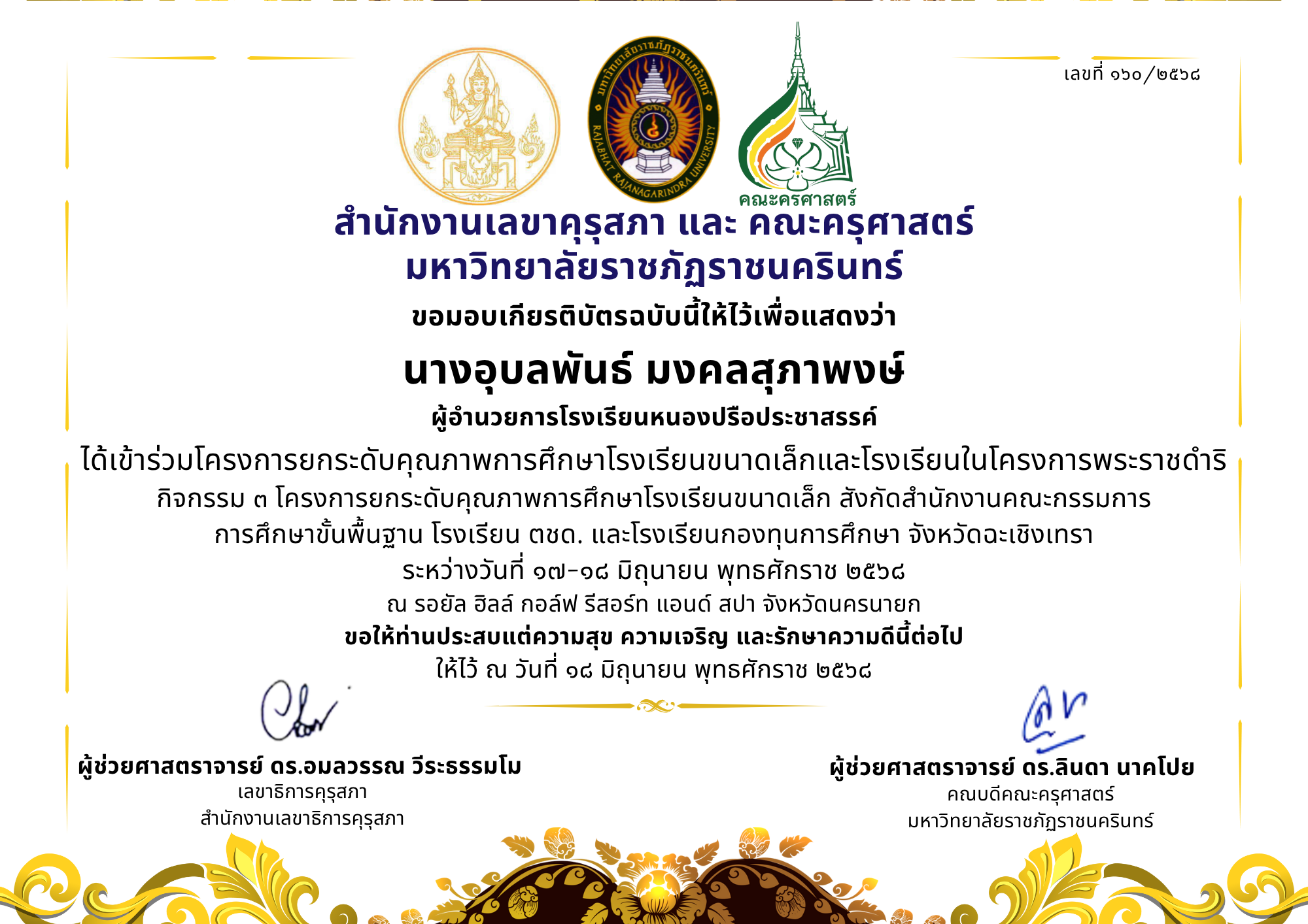 | 43 | นางอุบลพันธ์ มงคลสุภาพงษ์ | ผู้บริหารสถานศึกษา | หนองปรือประชาสรรค์ | โครงการยกระดับคุณภาพการศึกษาโรงเรียนขนาดเล็กและโรงเรียนในโครงการพระราชดำริกิจกรรมที่สามโครงการยกระดับคุณภาพการศึกษาโรงเรียนขนาดเล็กสังกัดสำนักงานคณะกรรมการการศึกษาขั้นพื้นฐานโรงเรียนตชาดอโรงเรียนกองทุนการศึกษาจังหวัดฉะเชิงเทรา 18 มิถุนายน 2568 | อื่นๆ | ชาติ | 2025-06-18 | สำนักงานเลขาคุรุสภาและคณะคุรุศาสตร์มหาวิทยาลัยราชภัฎราชนครินทร์ | เปิดไฟล์ |