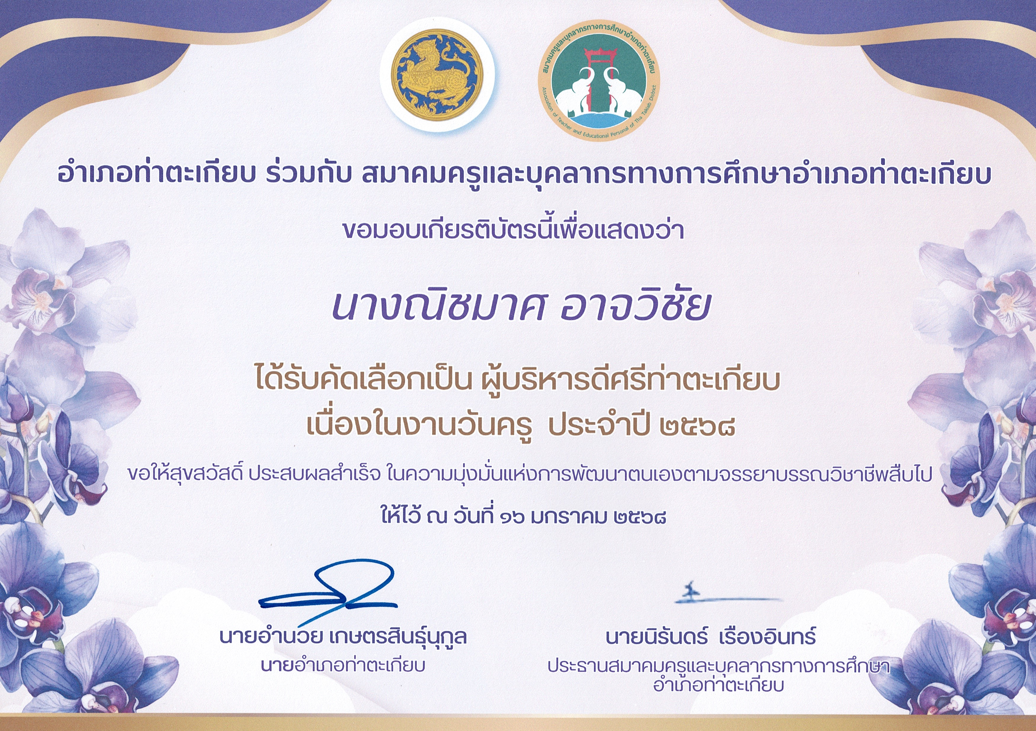 | 65 | นางณิชมาศ อาจวิชัย | ผู้บริหารสถานศึกษา | บ้านกรอกสะแก | ได้รับการคัดเลือกเป็นผู้บริหารดีศรีท่าตะเกียบ เนื่องในงานวันครู ประจำปี 2568 | อื่นๆ | ระดับเขตคุณภาพการศึกษา | 2025-01-16 | อำเภอท่าตะเกียบร่วมกับสมาคมครูและบุคลากรทางการศึกษาอำเภอท่าตะเกียบ | เปิดไฟล์ |
