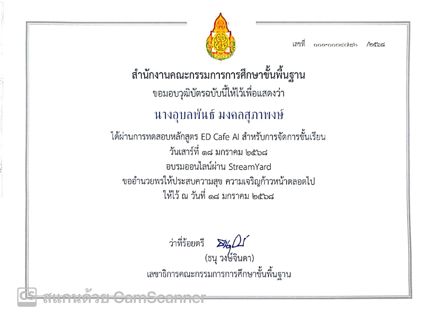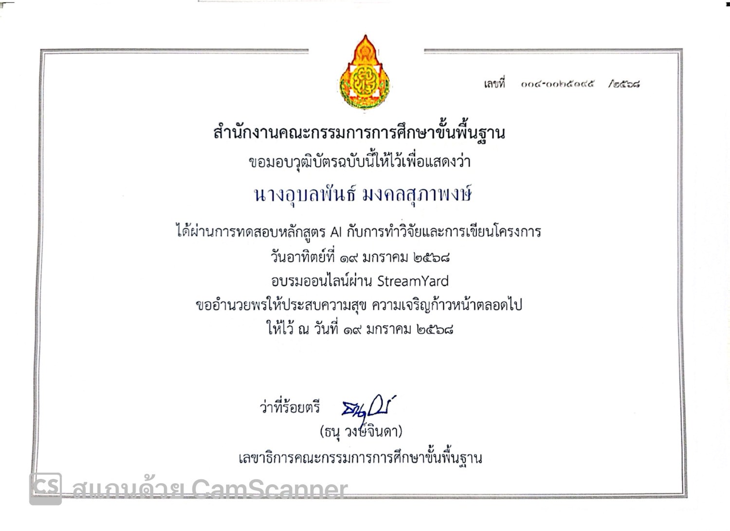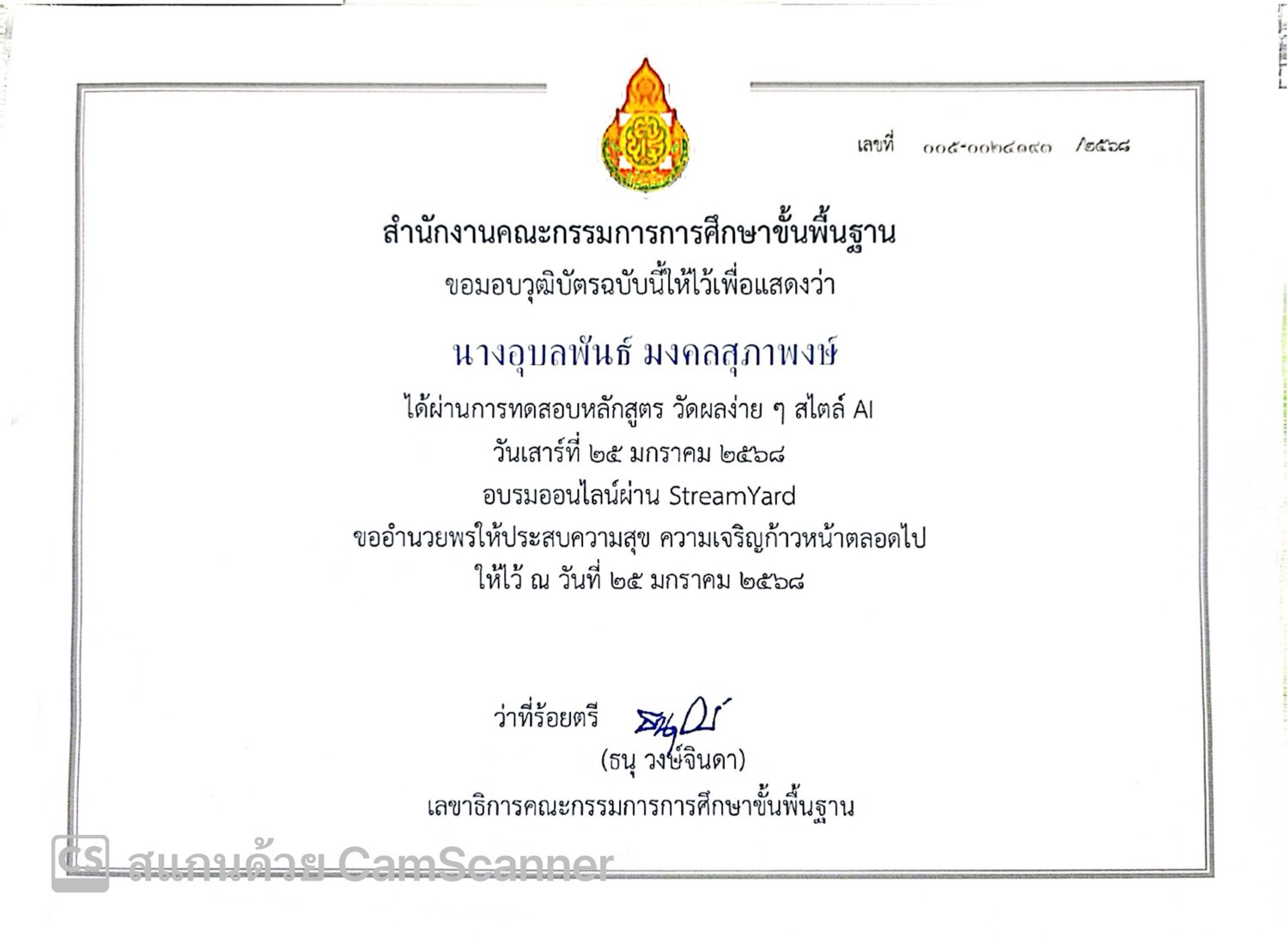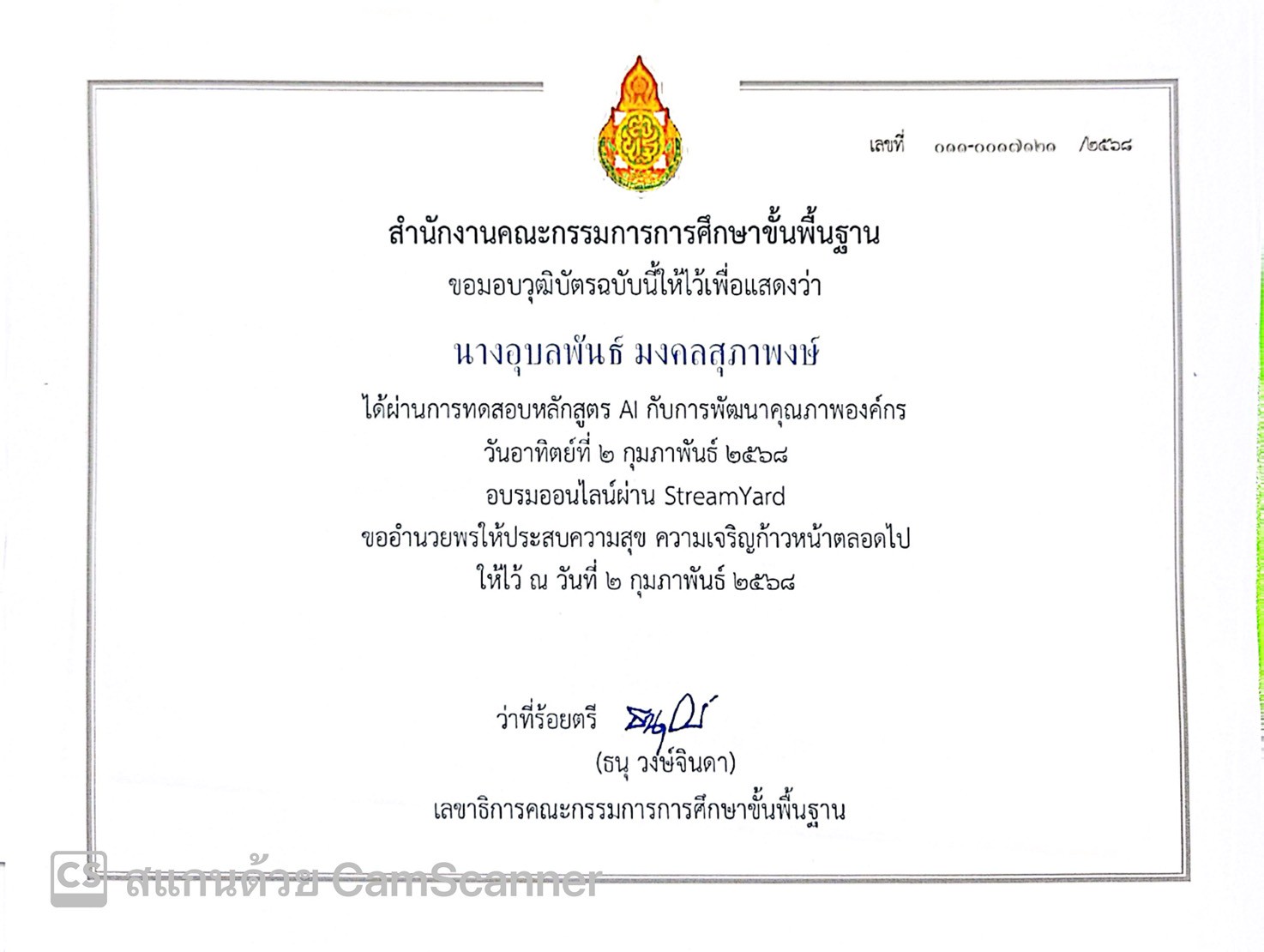 | 62 | นางอุบลพันธ์ มงคลสุภาพงษ์ | ผู้บริหารสถานศึกษา | หนองปรือประชาสรรค์ | ผ่านการทดสอบหลักสูตร ai กับการพัฒนาคุณภาพองค์กร ออนไลน์ผ่าน StreamYard 2 กุมภาพันธ์ 2568 | อื่นๆ | ชาติ | 2025-02-02 | สำนักงานคณะกรรมการการศึกษาขั้นพื้นฐาน | เปิดไฟล์ |