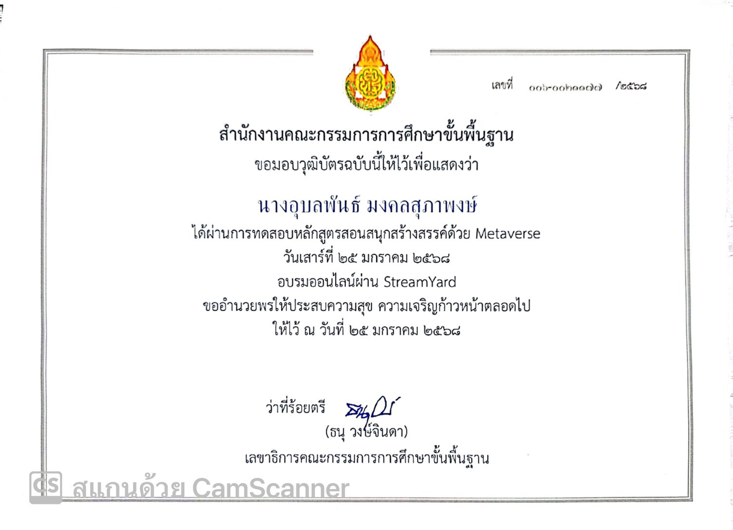 | 57 | นางอุบลพันธ์ มงคลสุภาพงษ์ | ผู้บริหารสถานศึกษา | หนองปรือประชาสรรค์ | ผ่านการทดสอบหลักสูตรสอนสนุกสร้างสรรค์ด้วยMetaverse อบรมออนไลน์ผ่าน StreamYard 25 มกราคม2568 | อื่นๆ | ชาติ | 2025-01-25 | สำนักงานคณะกรรมการการศึกษาขั้นพื้นฐาน | เปิดไฟล์ |