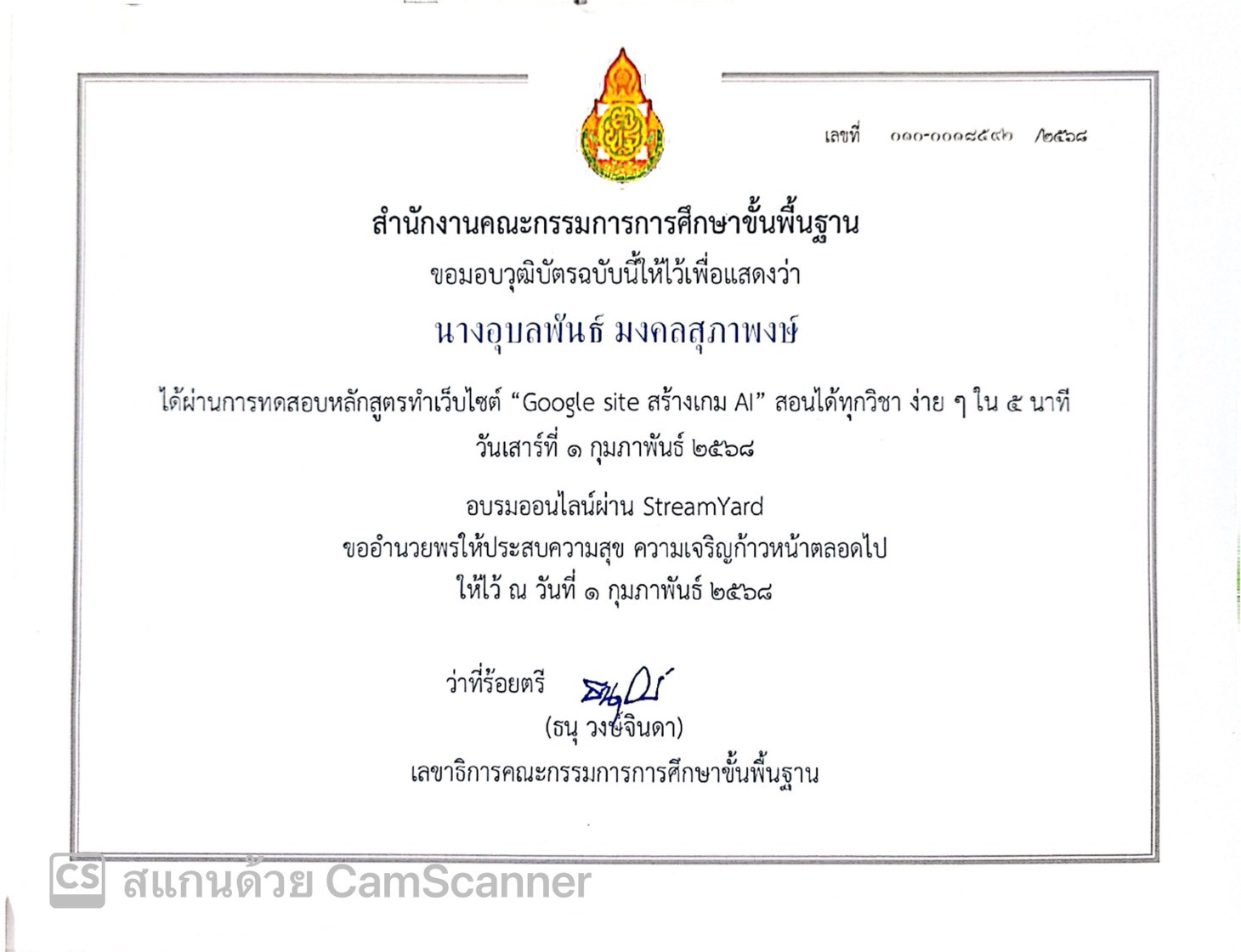 | 61 | นางอุบลพันธ์ มงคลสุภาพงษ์ | ผู้บริหารสถานศึกษา | หนองปรือประชาสรรค์ | ผ่านการทดสอบหลักสูตรการทำเว็บไซต์ Googlesite. สร้างเกม ai สอนได้ทุกวิชาง่ายง่ายใน 5 นาที ออนไลน์ผ่าน StreamYard 1 กุมภาพันธ์ 2568 | อื่นๆ | ชาติ | 2025-02-01 | สำนักงานคณะกรรมการการศึกษาขั้นพื้นฐาน | เปิดไฟล์ |