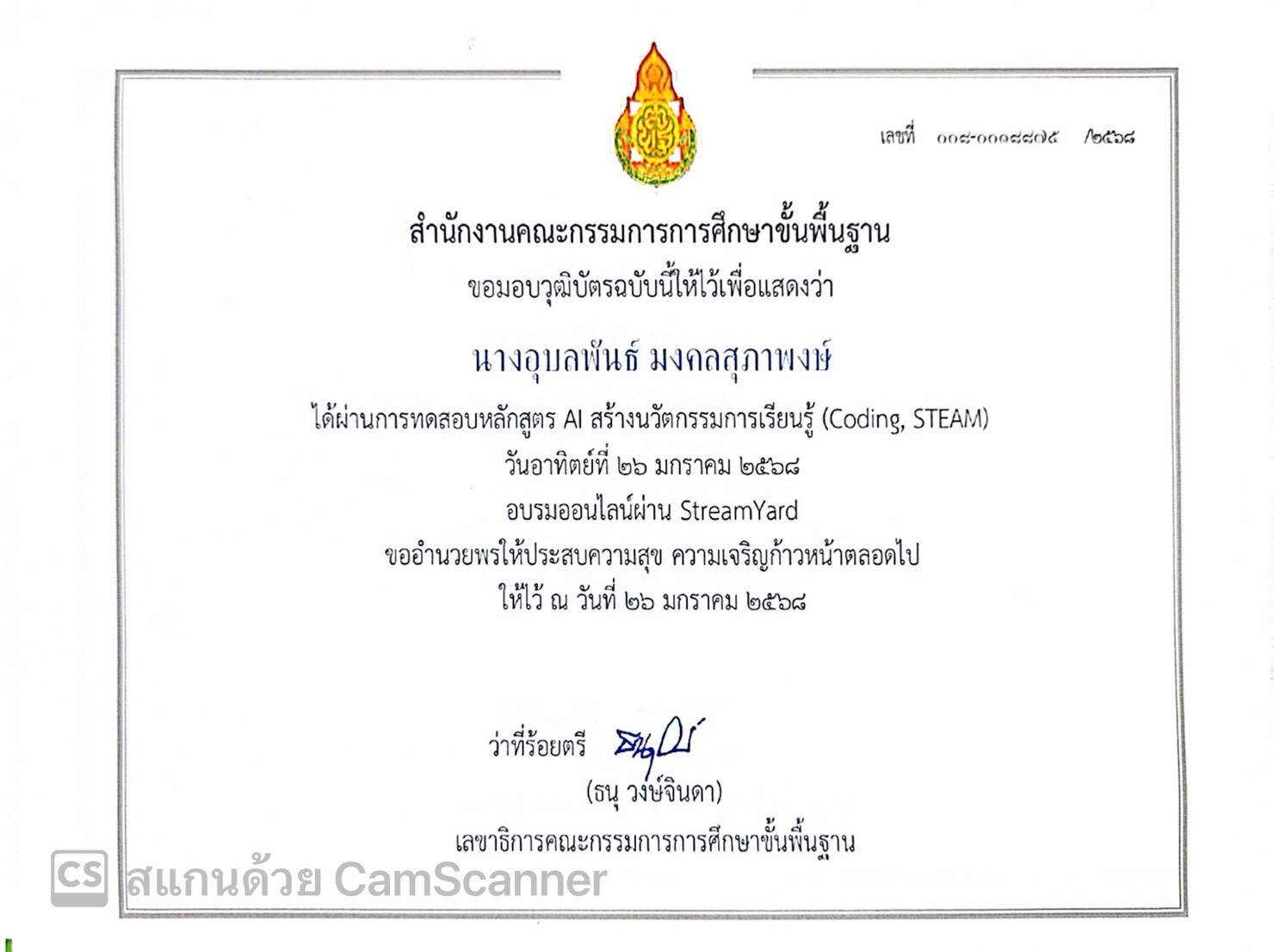 | 59 | นางอุบลพันธ์ มงคลสุภาพงษ์ | ผู้บริหารสถานศึกษา | หนองปรือประชาสรรค์ | ผ่านการทดสอบหลักสูตร ai สร้างนวัตกรรมการเรียนรู้ coding. Steam อบรมออนไลน์ผ่าน StreamYard 26 มกราคม2568 | อื่นๆ | ชาติ | 2025-01-26 | สำนักงานคณะกรรมการการศึกษาขั้นพื้นฐาน | เปิดไฟล์ |
