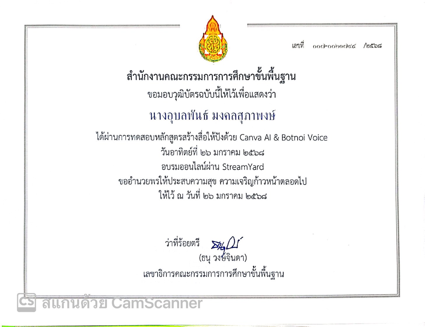 | 58 | นางอุบลพันธ์ มงคลสุภาพงษ์ | ผู้บริหารสถานศึกษา | หนองปรือประชาสรรค์ | ผ่านการทดสอบหลักสูตรสร้างสื่อให้ปังด้วย Canva Ai and Botnoi voice อบรมออนไลน์ผ่าน StreamYard 26 มกราคม2568 | อื่นๆ | ชาติ | 2025-01-26 | สำนักงานคณะกรรมการการศึกษาขั้นพื้นฐาน | เปิดไฟล์ |