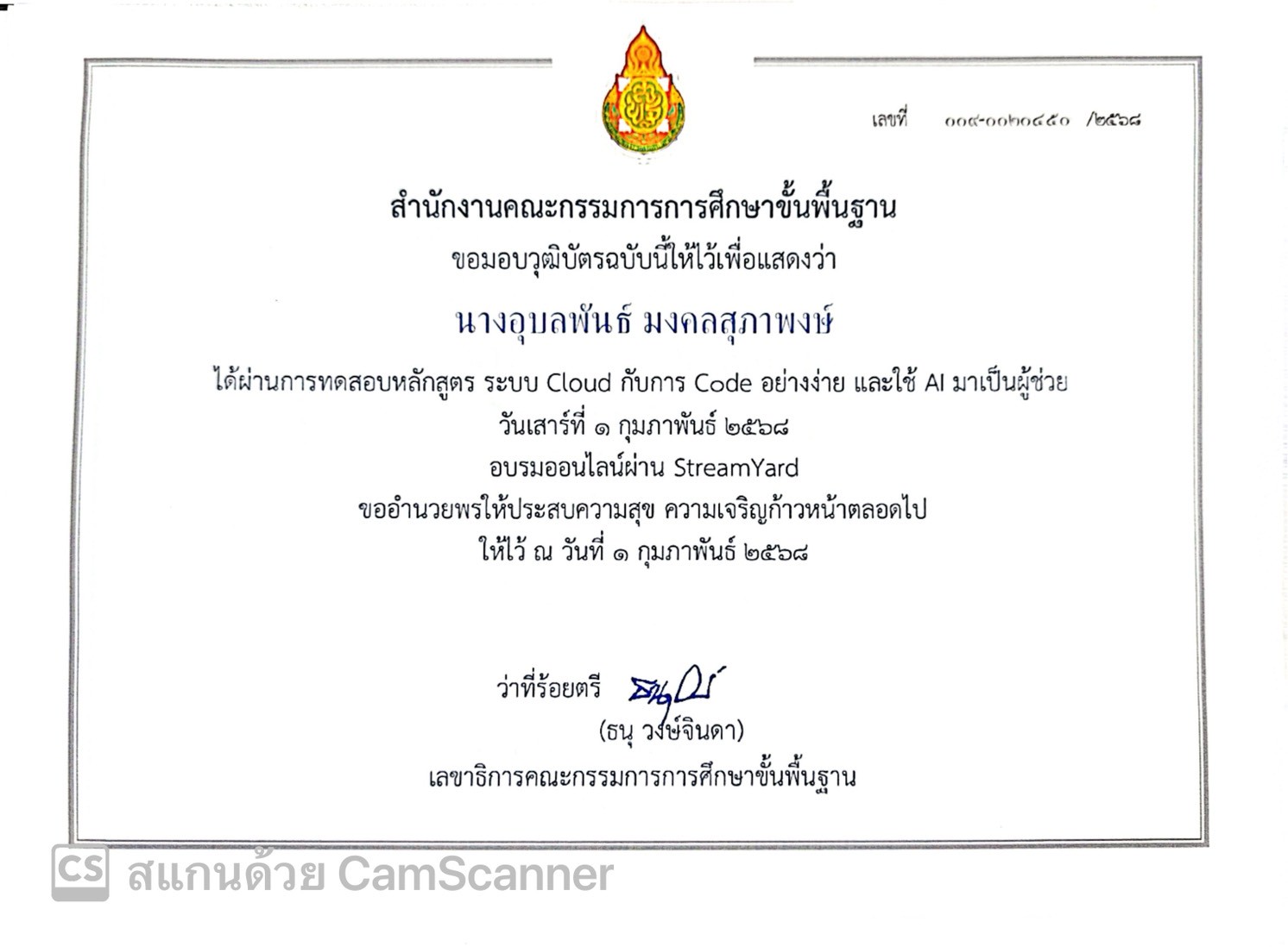 | 60 | นางอุบลพันธ์ มงคลสุภาพงษ์ | ผู้บริหารสถานศึกษา | หนองปรือประชาสรรค์ | ผ่านการทดสอบหลักสูตรระบบ cloud กับการ code อย่างง่ายและใช้ ai มาเป็นผู้ช่วย อบรมออนไลน์ผ่าน StreamYard 1 กุมภาพันธ์ 2568 | อื่นๆ | ชาติ | 2025-02-01 | สำนักงานคณะกรรมการการศึกษาขั้นพื้นฐาน | เปิดไฟล์ |