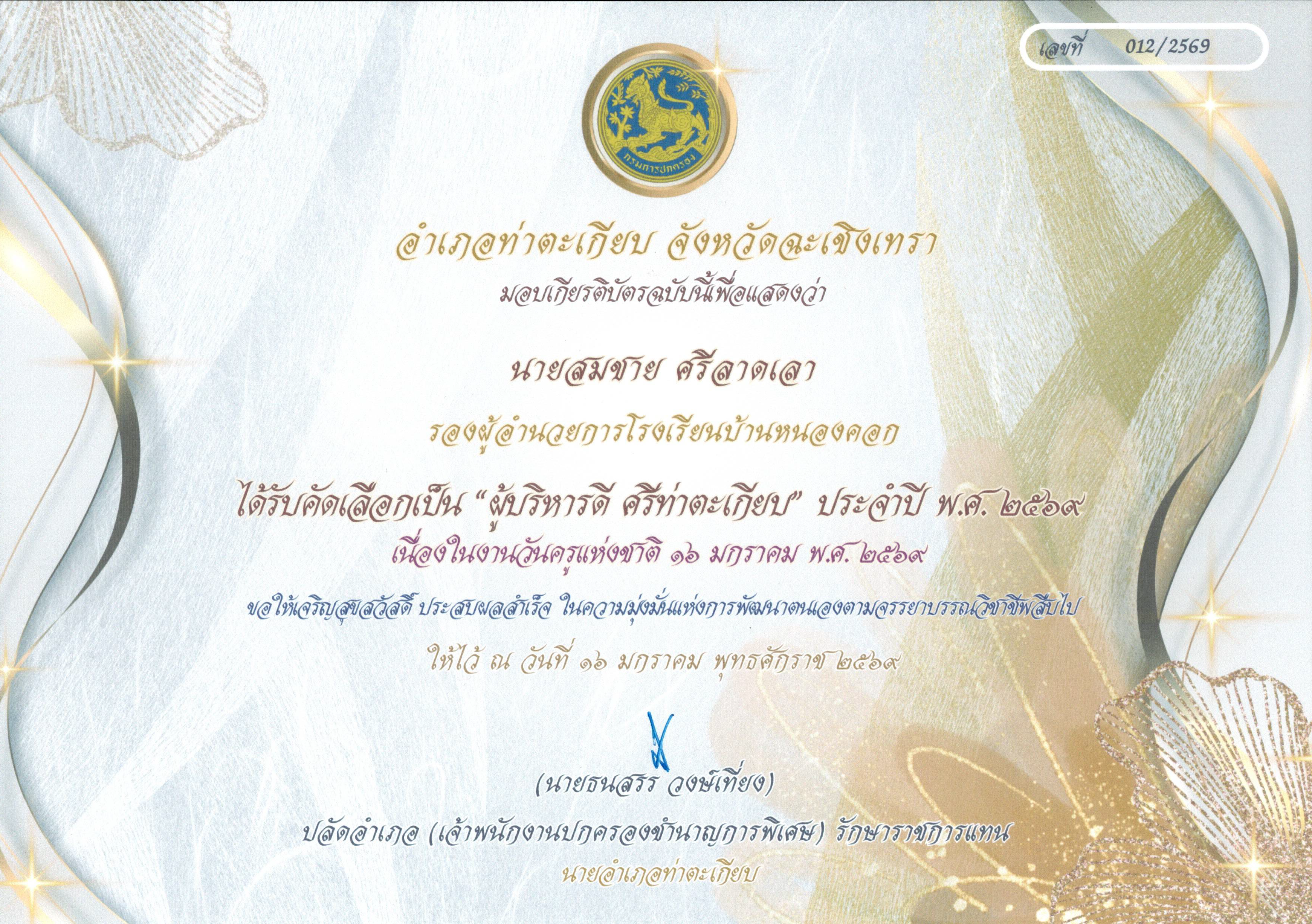 | 1 | นายสมชาย ศรีลาดเลา | รองผู้บริหารสถานศึกษา | บ้านหนองคอก | ผู้บริหารดี ศรีท่าตะเกียบ ประจำปี 2569 | อื่นๆ | เขตพื้นที่การศึกษา | 2026-01-16 | นายอำเภอท่าตะเกียบ | เปิดไฟล์ |