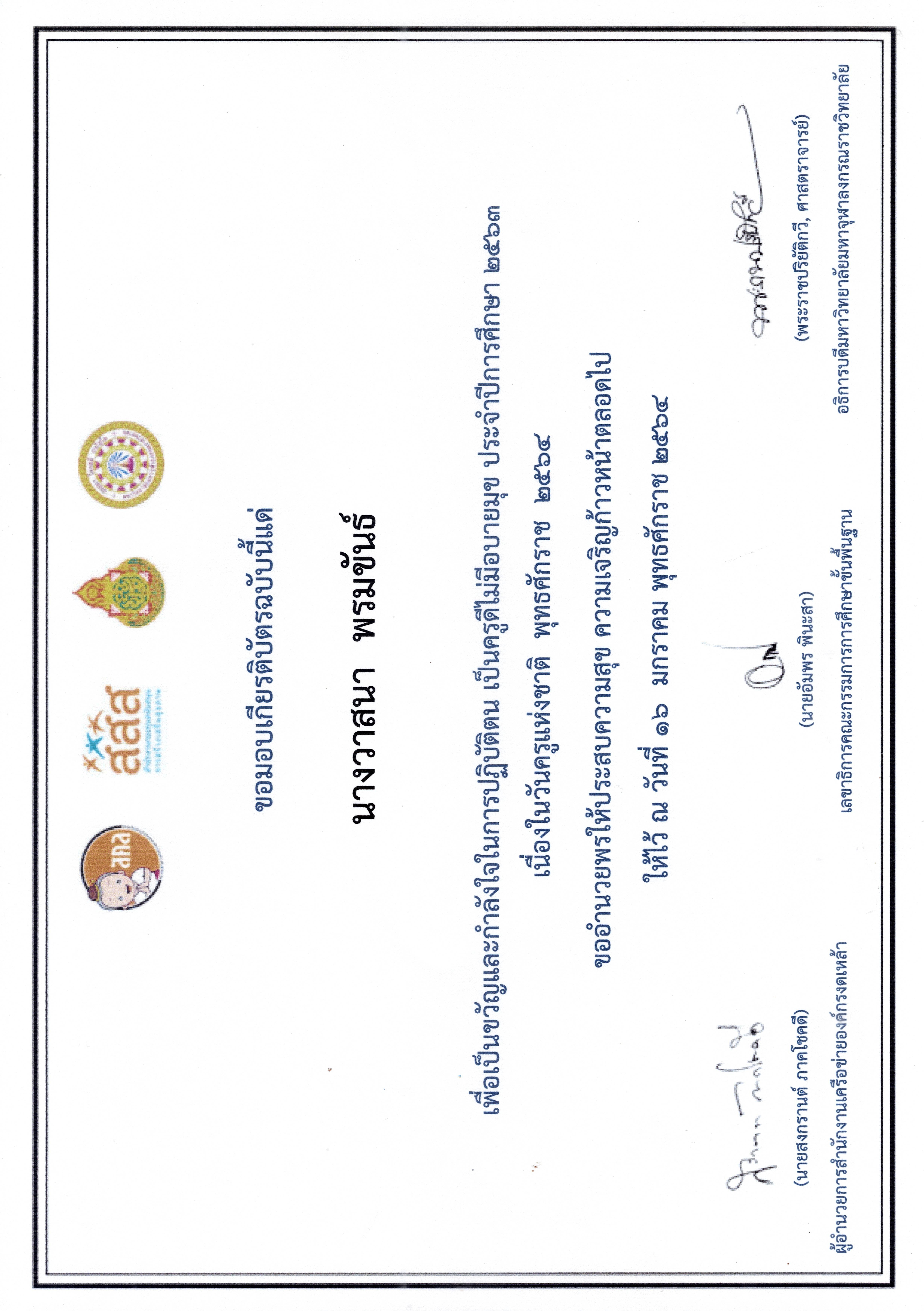 | 16 | นายศรีวิชัย ชัยฉลาด | ครู | วัดเกาะแก้วเวฬุวัน | ครูดีไม่มีอบายมุข | อื่นๆ | ชาติ | 2021-01-16 | สำนักงานเครือข่ายองค์กรงดเหล้า (สคล.)สำนักงานคณะกรรมการการศึกษาขั้นพื้นฐาน (สพฐ.) มหาวิทยาลัยมหาจุฬาลงกรณราชวิทยาลัย (มจร.) สำนักงานกองทุน สนับสนุนการสร้างเสริมสุขภาพ (สสส.) เครือข่ายโรงเรียนคำพ่อสอน | เปิดไฟล์ |