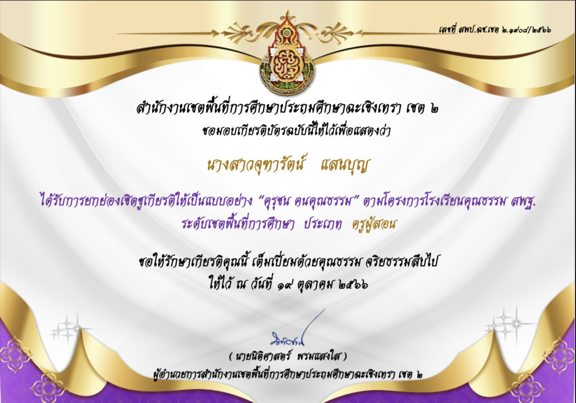 | 40 | นางสาวจุฑารัตน์ แสนบุญ | ครู | วัดดอนท่านา | ได้รับการยกย่องเชิดชูเกียรติให้เป็นแบบอย่าง "คุรุชน คนคุณธรรม" ตามโครงการโรงเรียนคุณธรรม สพฐ. | อื่นๆ | เขตพื้นที่การศึกษา | 2023-10-19 | สำนักงานเขตพื้นที่การศึกษาประถมศึกษาฉะเชิงเทรา เขต 2 | เปิดไฟล์ |