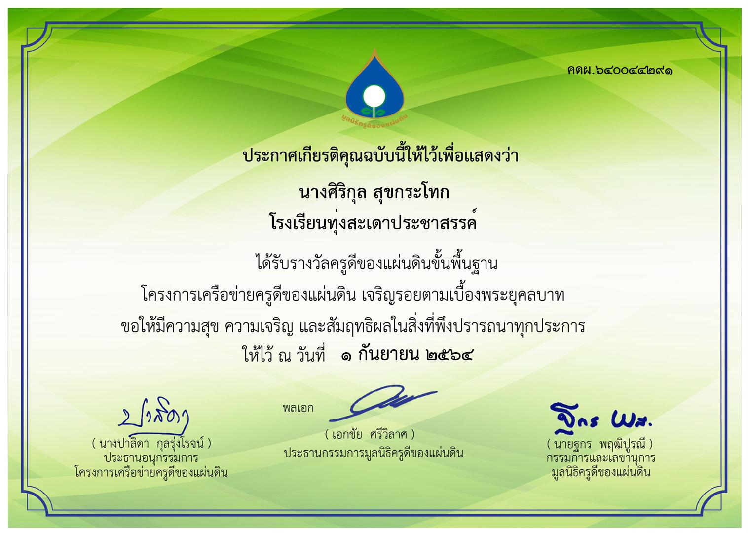 | 53 | นางศิริกุล สุขกระโทก | ครู | ทุ่งสะเดาประชาสรรค์ | ครูดีของแผ่นดินขั้นพื้นฐาน | อื่นๆ | เขตพื้นที่การศึกษา | 2021-09-01 | มูลนิธิครูดีของแผ่นดิน | เปิดไฟล์ |