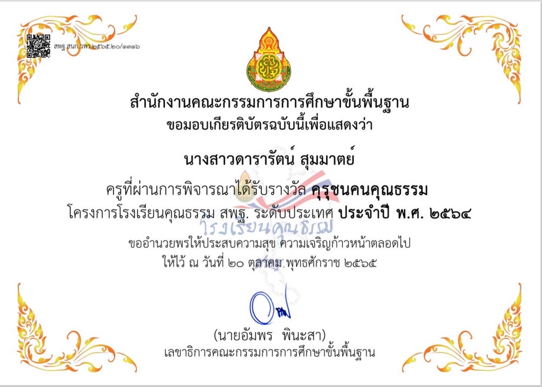 | 80 | นางสาวดารารัตน์ สมมาตย์ | ครู | บ้านทุ่งส่าย | รางวัลคุรุชนคนคุณธรรม โครงการโรงเรียนคุณธรรม สพฐ.ระดับประเทศ ประจำปี พ.ศ.2564 | อื่นๆ | ชาติ | 2564-10-20 | เลขาธิการคณะกรรมการการศึกษาขั้นพื้นฐาน | เปิดไฟล์ |