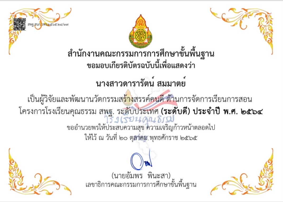 | 2 | นายกายกานต์ แก้วคำ | ครู | วัดพงษาราม | เกียรติบัตร เป็นคณะทำงานสร้างและพัฒนาเครื่องมือประเมินความสามารถด้านการอ่านชั้น ป.๑ (Reading Test:RT) ปีการศึกษา๒๕๖๔ | อื่นๆ | ชาติ | 2022-11-22 | สพฐ. | เปิดไฟล์ |