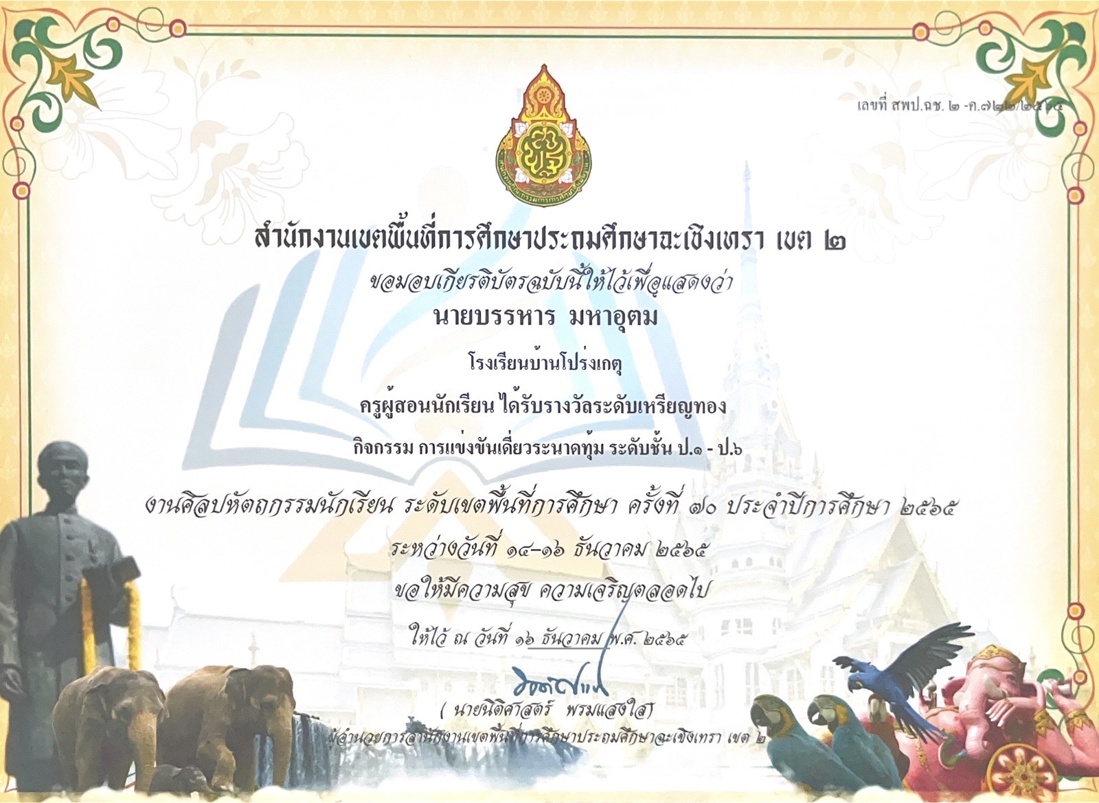 | 44 | นายบรรหาร มหาอุตม์ | ครู | บ้านโปร่งเกตุ | ครูผู้สอนนักเรียน ได้รับรางวัลเหรียญทอง กิจกรรมการแข่งขันเดี่ยวระนาดทุ้ม ป.1-ป.6 | อื่นๆ | เขตพื้นที่การศึกษา | 2022-12-16 | สำนักงานเขตพื้นที่การศึกษาประถมฉะเชิงเทรา เขต 2 | เปิดไฟล์ |