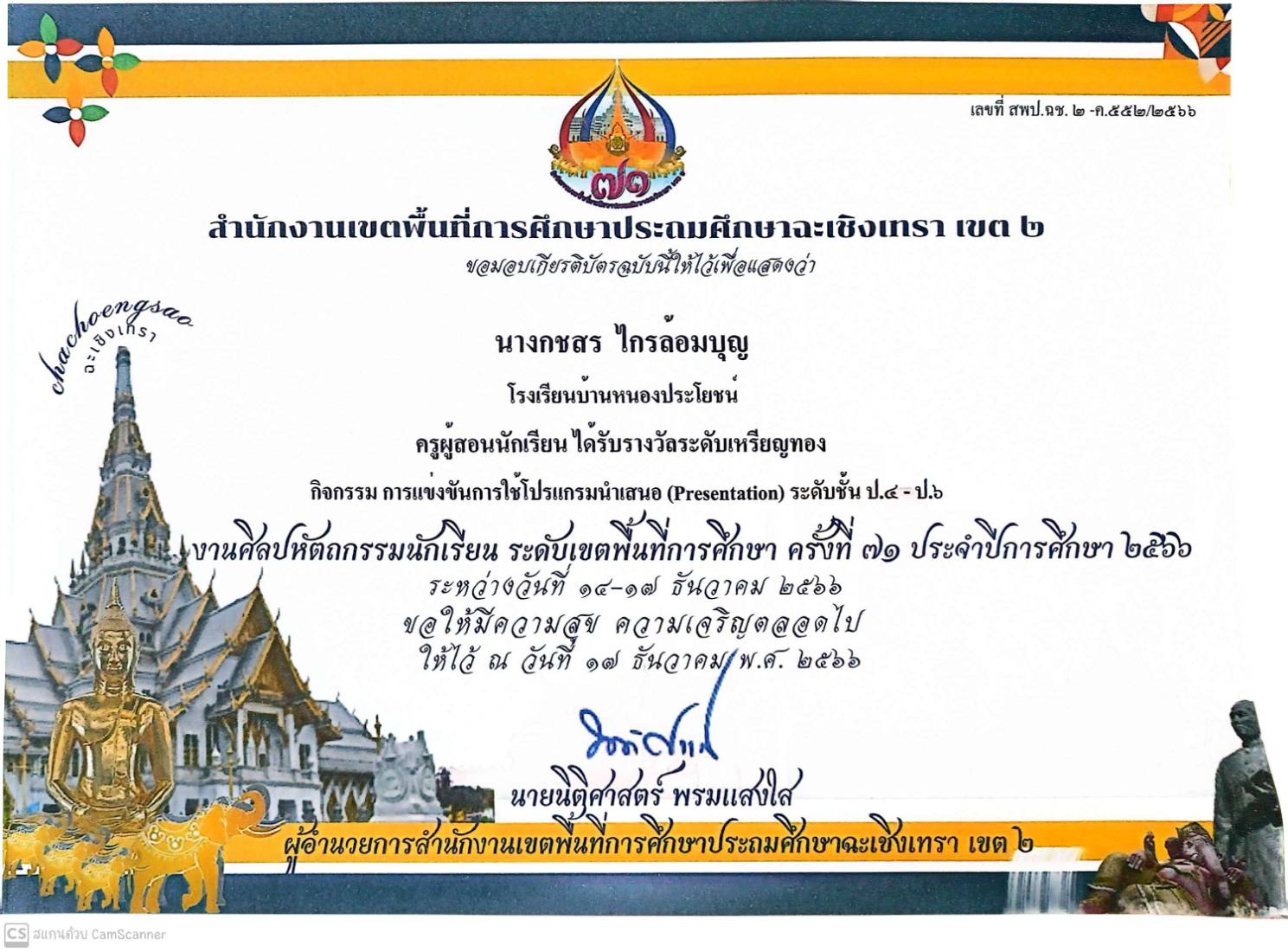 | 70 | กชสร ไกรล้อมบุญ | ครู | บ้านหนองประโยชน์ | การแข่งขันการใช้โปรแกรมนำเสนอ (Presentation) ระดับชั้น ป.4-ป.6 | ชนะเลิศ | เขตพื้นที่การศึกษา | 2023-12-17 | สำนักงานเขตพื้นที่การศึกษาประถมศึกษาฉะเชิงเทรา เขต 2 | เปิดไฟล์ |