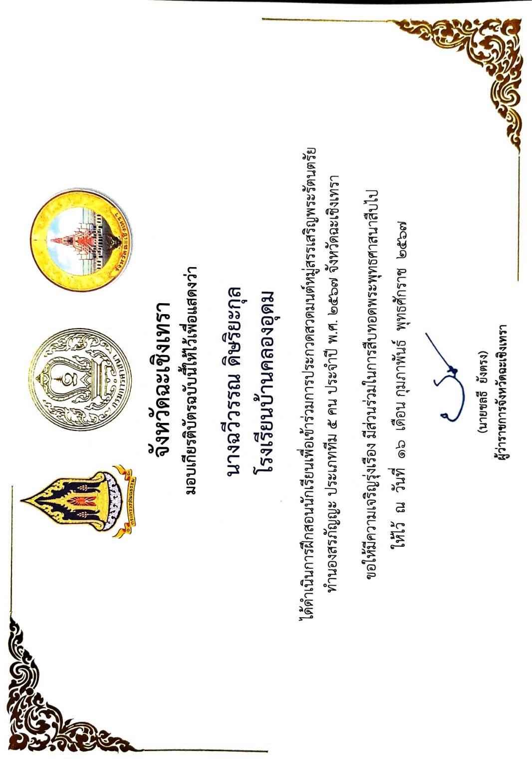 | 50 | นางฉวีวรรณ ดิษริยะกุล | ครู | บ้านคลองอุดม | ฝึกซ้อมนักเรียนเพื่อเข้าร่วมการประกวดสวดมนต์หมู่สรรเสริญพระรัตนตรัยทำนองสรภัญญะ ประเภททีม ๕ คน ประจำปี พ.ศ. ๒๕๖๗ จังหวัดฉะเชิงเทรา | อื่นๆ | จังหวัด | 2024-02-16 | จังหวัดฉะเชิงเทรา | เปิดไฟล์ |