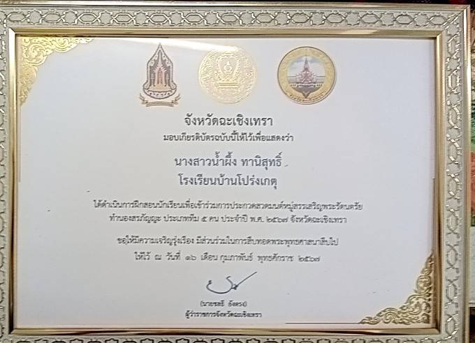 | 236 | นางสาวเพ็ญประภา ปั้นเจริญ | ครู | บ้านศรีเจริญทอง | ดำเนินการฝึกสอนนักเรียนเพื่อเข้าร่วมการประกวดสวดมนต์หมู่สรรเสริญพระรัตนตรัยทำนองสรภัญญะ ประเภททีม 5 คน ประจำปี พ.ศ. 2567 จังหวัดฉะเชิงเทรา | อื่นๆ | จังหวัด | 2024-02-16 | ศึกษาธิการจังหวัด | เปิดไฟล์ |