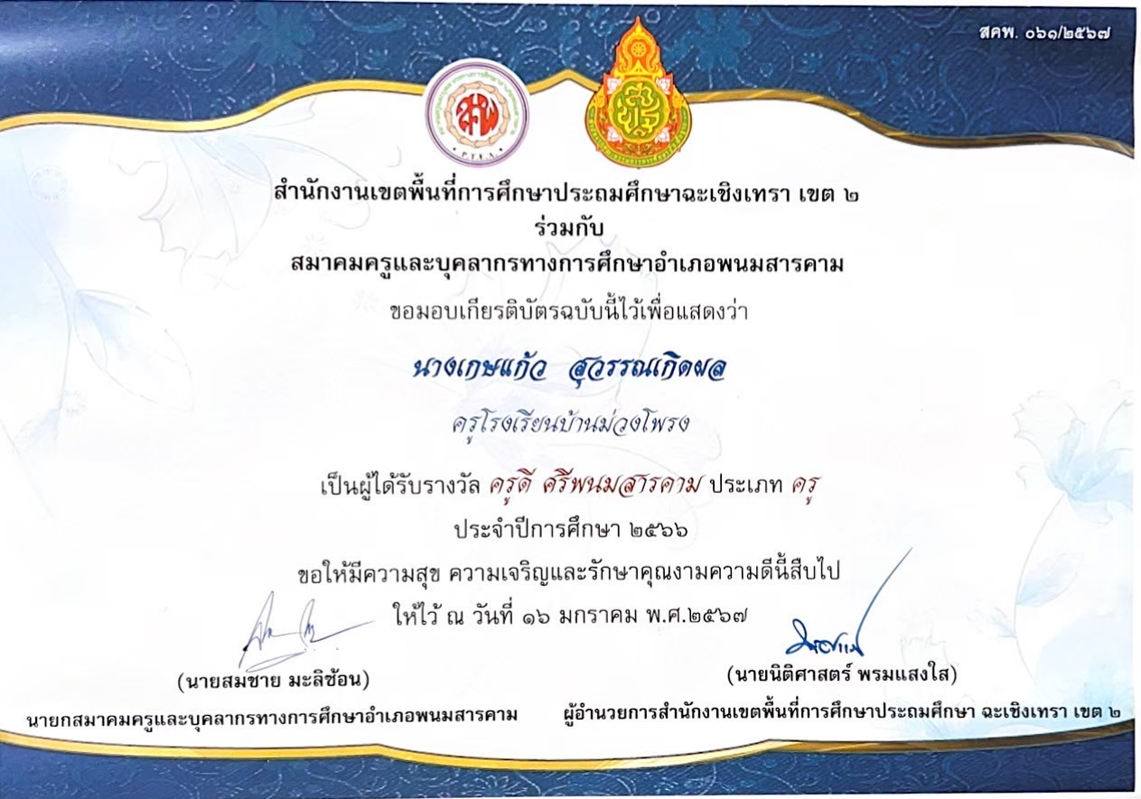 | 34 | นางเกษแก้ว สุวรรณเกิดผล | ครู | บ้านม่วงโพรง | ครูดี ศรีพนมสารคาม | อื่นๆ | เขตพื้นที่การศึกษา | 2024-01-16 | สำนักงานเขตพื้นที่การศึกษาประถมศึกษาฉะเชิงเทรา เขต 2 ร่วมกับสมาคมครูและบุคลากรทางการศึกษาอำเภอพนมสารคาม | เปิดไฟล์ |