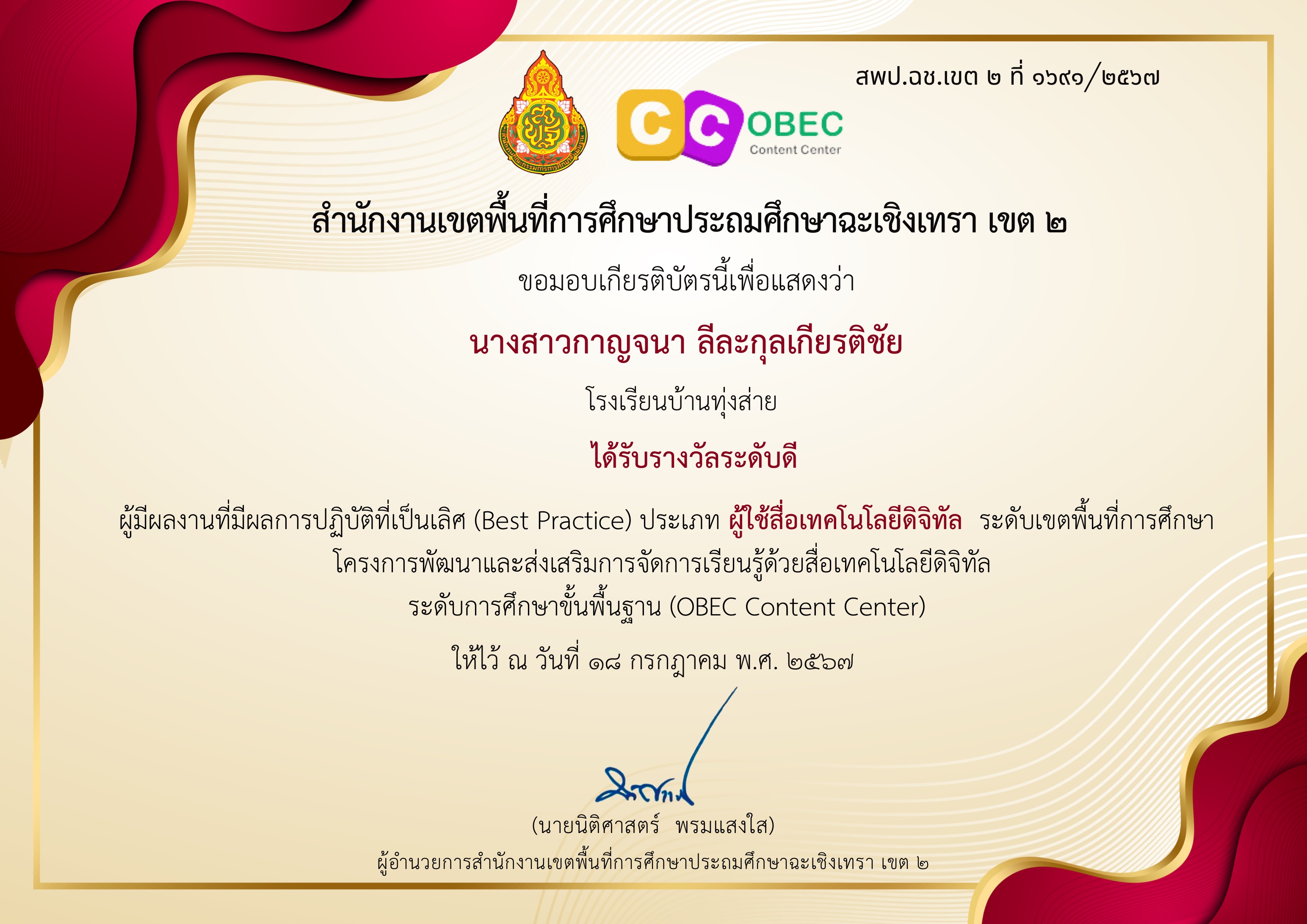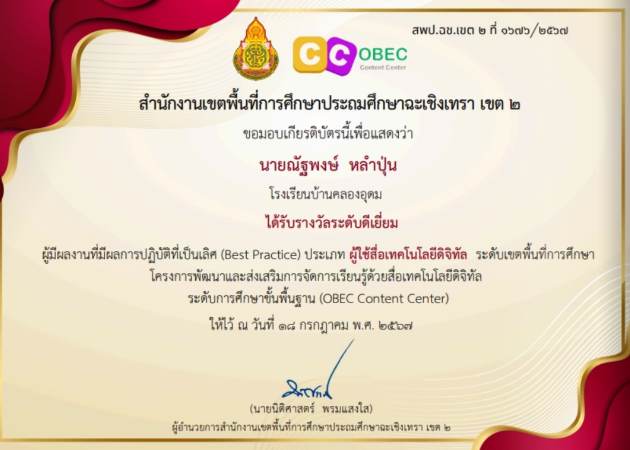 | 53 | นางสาวกนกอร พันธ์สระน้อย | ครู | วัดสะแกงาม | ผู้มีส่วนร่วมในกาส่งเสริม สนับสนุน พัฒนาสภาพสิ่วแวดล้มอและห้องเรียนที่มีคุณภาพและโดดเด่นเป็นไปตามแนวทางภารบริหารจัดการห้องเรียน (DLTV) | อื่นๆ | เขตพื้นที่การศึกษา | 2024-08-22 | สำนักงานเขตพื้นที่การศึกษาประถมศึกษาฉะเชิงเทรา เขต 2 | เปิดไฟล์ |