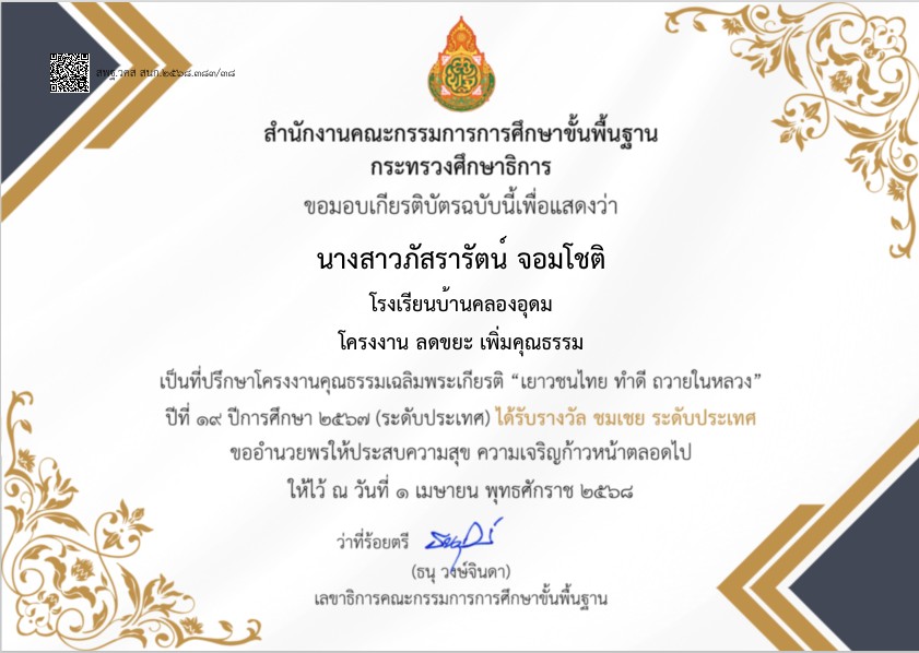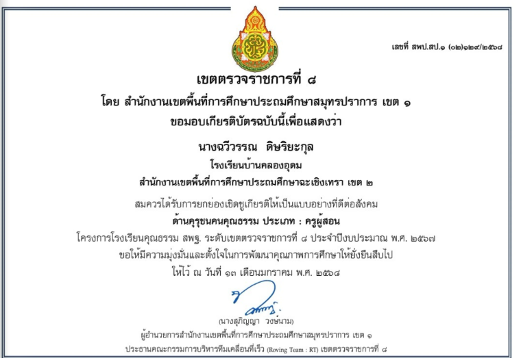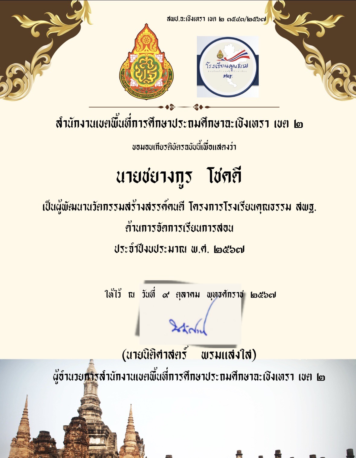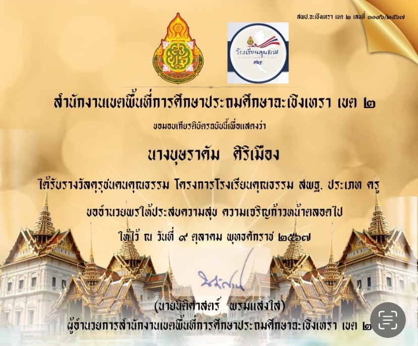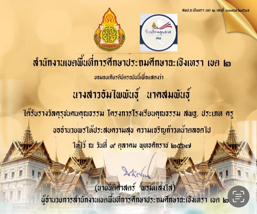 | 26 | นายณัฐวุฒิ ร้อยสา | ครู | บ้านเขาหินซ้อน | คุรุชนคนคุณธรรม โครงการโรงเรียนคุณธรรม สพฐ. ประเภท ครู | อื่นๆ | เขตพื้นที่การศึกษา | 2024-10-09 | สำนักงานเขตพื้นที่การศึกษาประถมศึกษาฉะเชิงเทรา เขต 2 | เปิดไฟล์ |