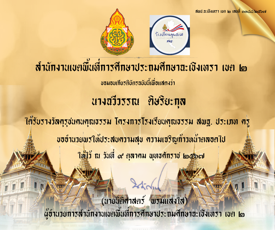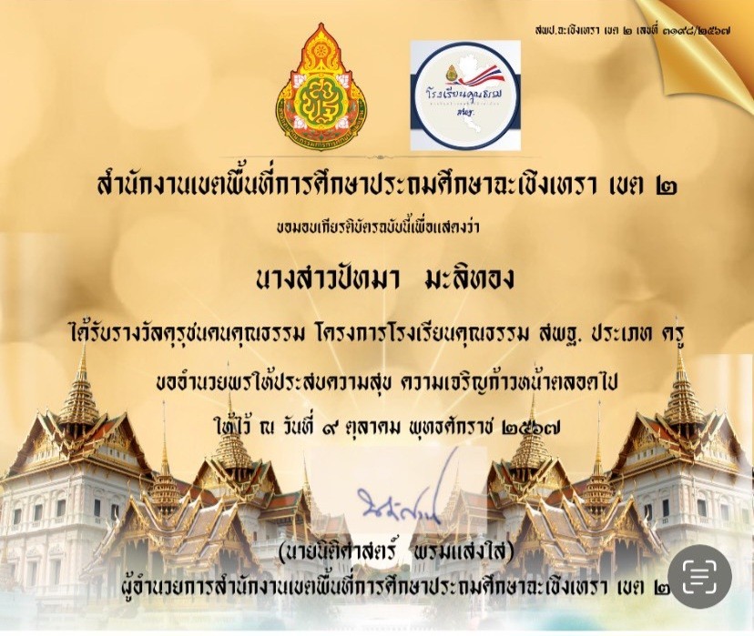 | 192 | นางสาวณัฐพัชร์ เหลืองเพชรงาม | ครู | ไทยรัฐวิทยา ๔๑(บ้านหัวนาศรีวิเชียรประชาอุทิศ) | ได้รับรางวัลคุรุชนคนคุณธรรม โครงการโรงเรียนคุณธรรม สพฐ. ประเภท ครู | อื่นๆ | เขตพื้นที่การศึกษา | 2024-10-09 | สพป.ฉะเชิงเทรา เขต 2 | เปิดไฟล์ |