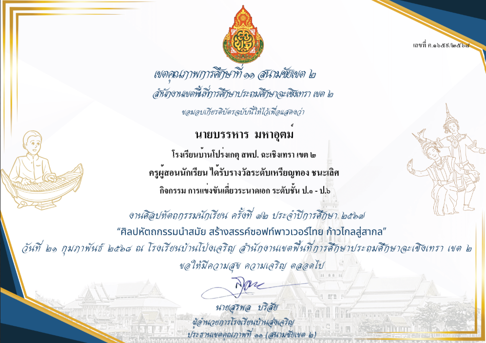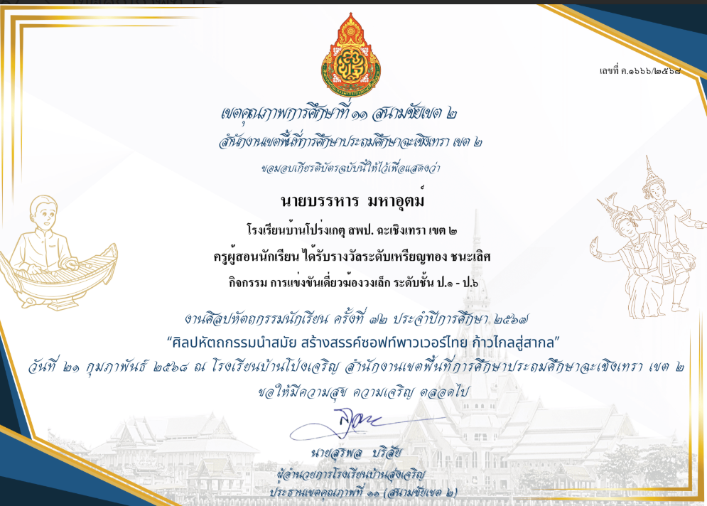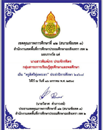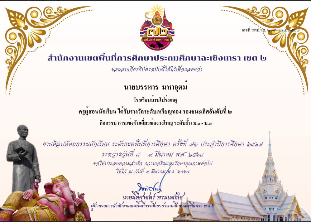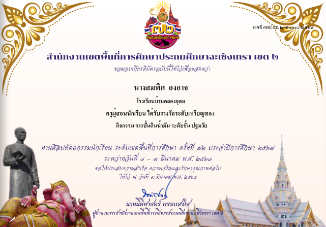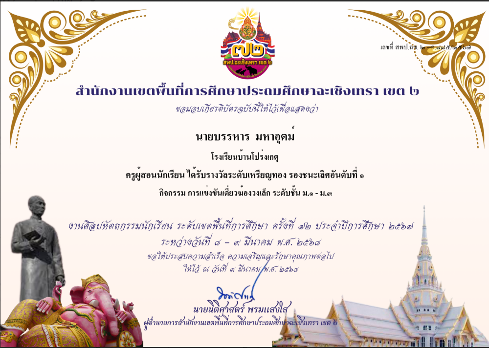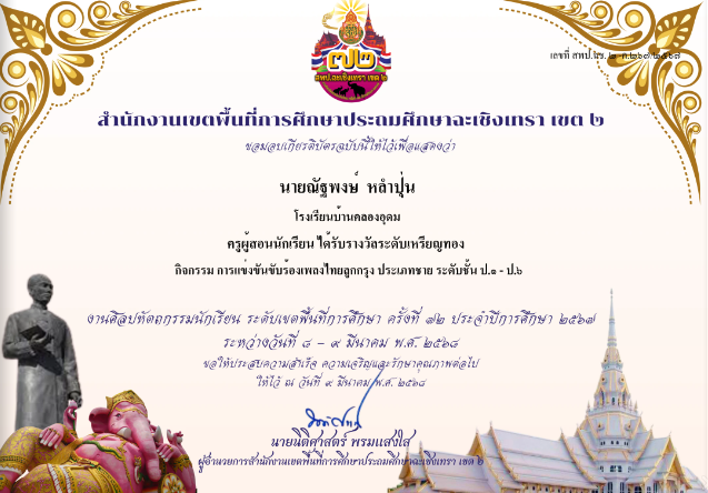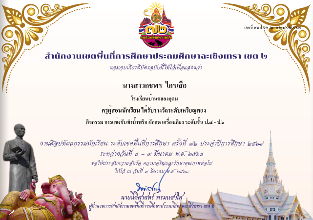 | 46 | นายภูมิสิษฐ์ ยุทธพิชญเปรม | ครู | วัดบึงกระจับ | ครูผู้สอน กิจกรรมการแข่งขันคีตะมวยไทย ระดับชั้น ป.1-6 งานศิลปหัตถกรรมนักเรียน ครั้งที่ 72 | รองชนะเลิศระดับเหรียญทอง | เขตพื้นที่การศึกษา | 2025-03-09 | สำนักงานเขตพื้นที่การศึกษาประถมศึกษาฉะเชิงเทรา เขต 2 | เปิดไฟล์ |