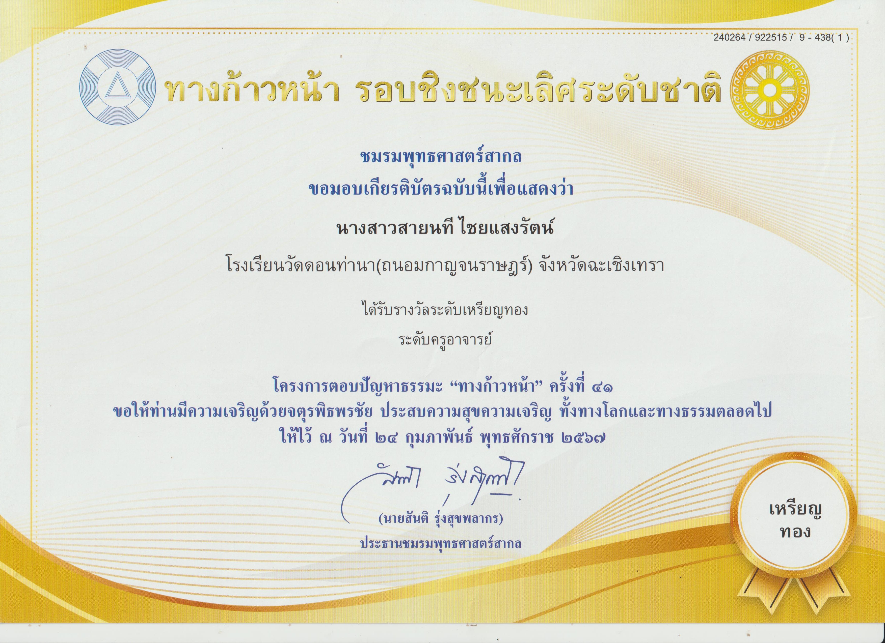 | 18 | พัชรดา นันทสินธ์ | ครู | วัดท่าเกวียน (สัยอุทิศ) | รางวัลชนะเลิศ ระดับเพชร ระดับครูอาจารย์ โครงการตอบปัญหาธรรมะ "ทางก้าวหน้า" ครั้งที่ 41 | ชนะเลิศ | ชาติ | 2024-02-24 | ชมรมพุทธศาสสตร์สากล | เปิดไฟล์ |