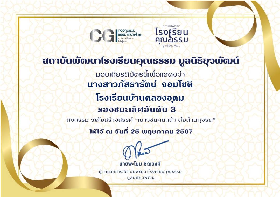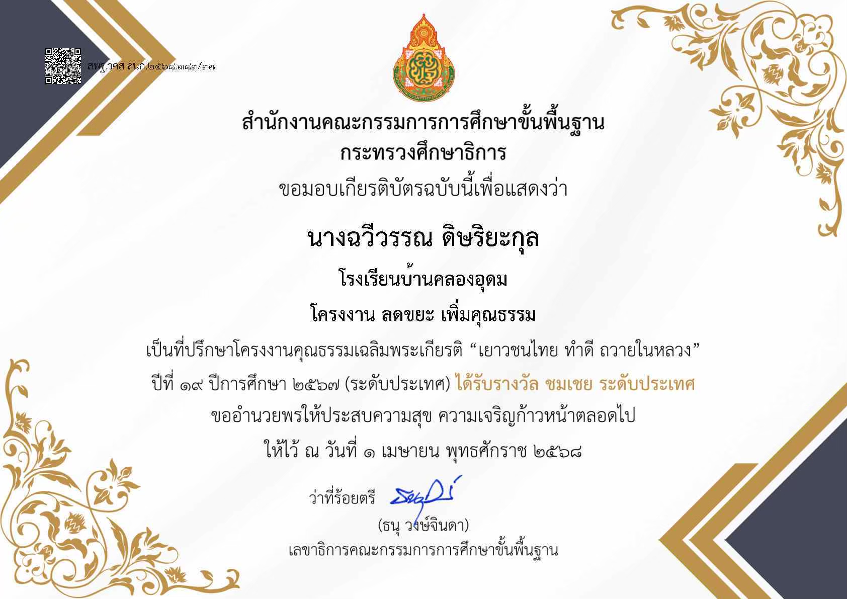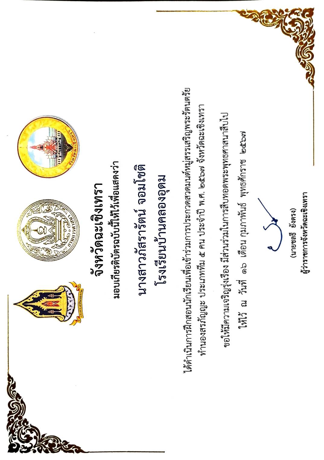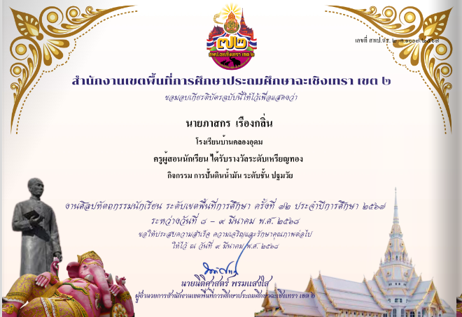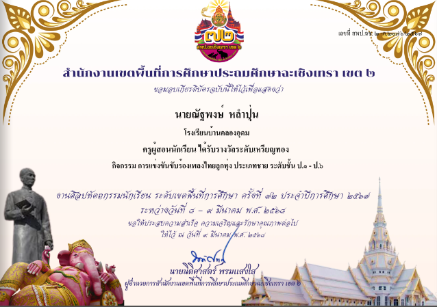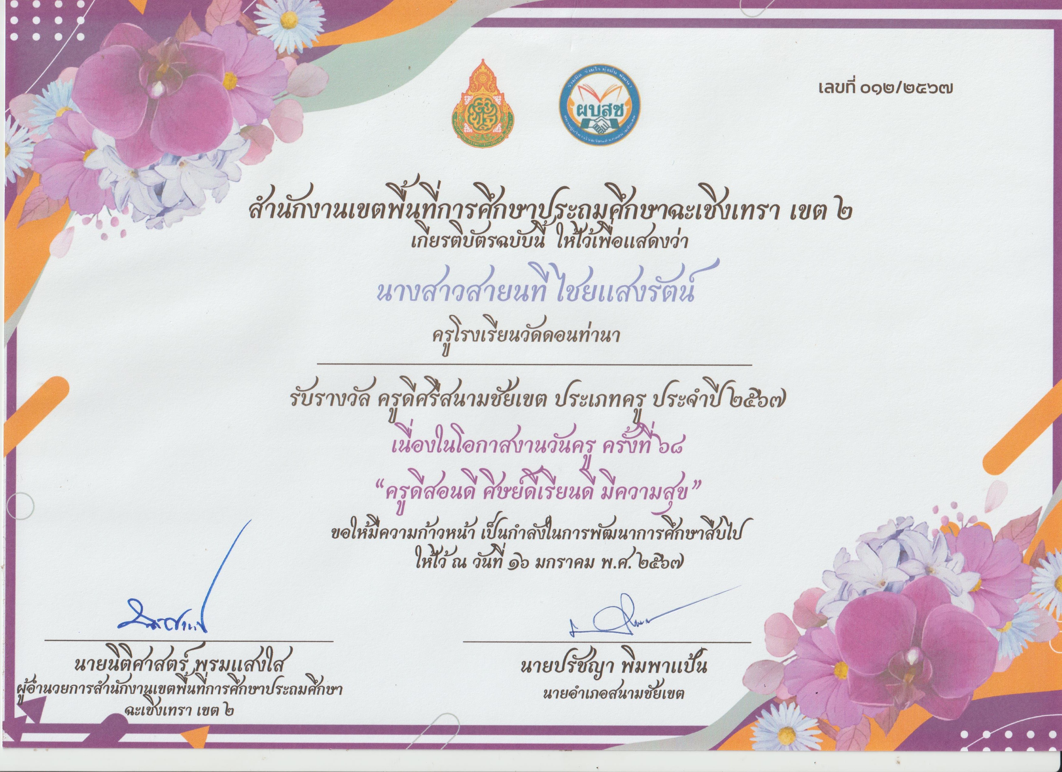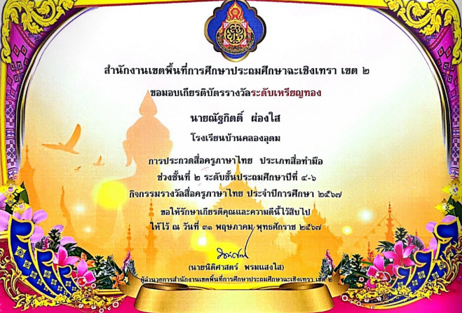 | 8 | นายธันยวัฒน์ สารกูล | ครู | วัดท่าลาดเหนือ | ครูผู้สอน กิจกรรมประกวดภาพยนต์สั้น ระดับชั้นประถมศึกษา ปีที่ 1-6 | รองชนะเลิศอันดับ 1 | ระดับเขตคุณภาพการศึกษา | 2567-01-27 | สำนักงานเขตพื้นที่การศึกษาประถมศึกษาฉะเชิงเทรา เขต 2 | เปิดไฟล์ |
