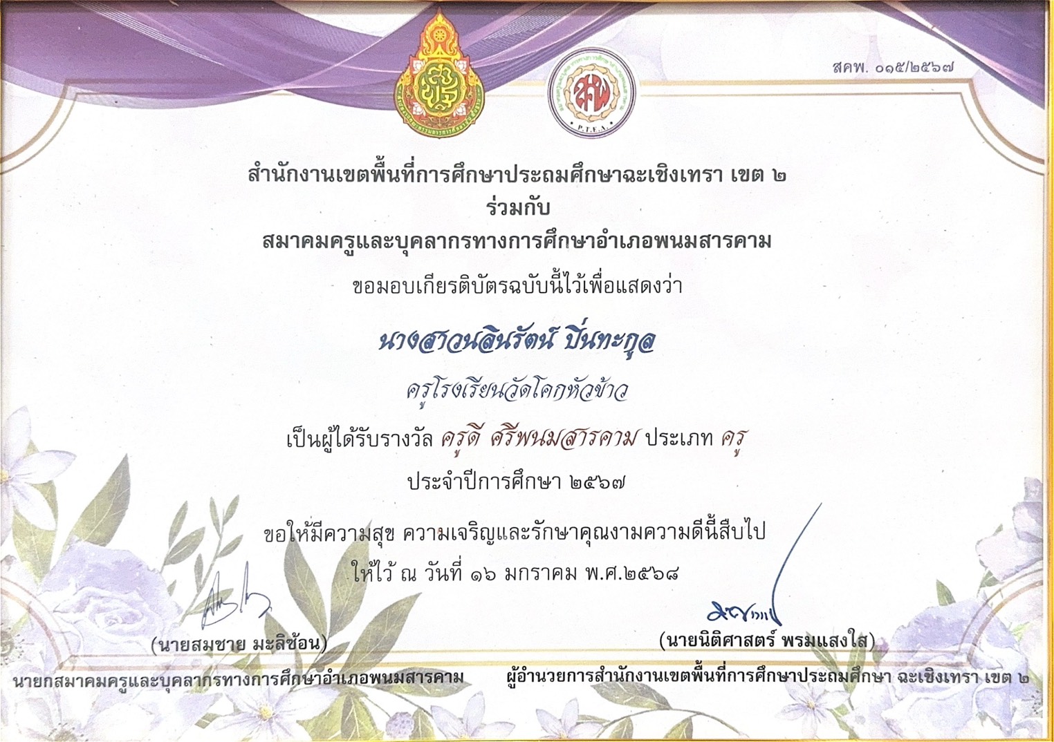 | 14 | นางสาวศิริพร เข็มมุข | ครู | วัดหัวกระสังข์(มะลิเสงี่ยมราษฎร์สามัคคี) | ครูดี ศรีพนมสารคาม | อื่นๆ | เขตพื้นที่การศึกษา | 2024-01-16 | สพป.ฉะเชิงเทรา เขต 2 | เปิดไฟล์ |