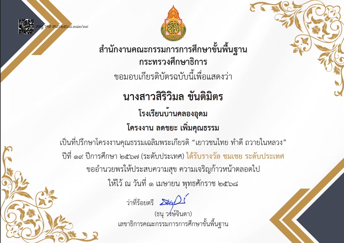 | 157 | นางสาวสิริวิมล ขันติมิตร | ครู | บ้านคลองอุดม | รางวัลคุรุชนคนคุณธรรม โครงการโรงเรียนคุณธรรม สพฐ. ประเภทครู | อื่นๆ | เขตพื้นที่การศึกษา | 2024-10-09 | สำนักงานเขตพื้นที่การศึกษาประถมศึกษาฉะเชิงเทรา เขต ๒ | เปิดไฟล์ |