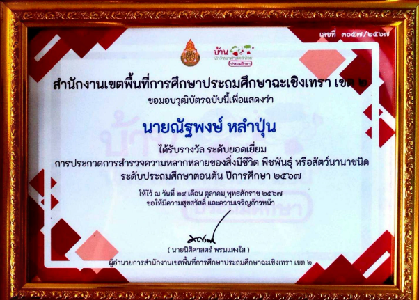 | 164 | นายณัฐพงษ์ หลำปุ่น | ครู | บ้านคลองอุดม | รางวัล ระดับยอดเยี่ยม การประกวดการสำรวจความหลากหลายของสิ่งมีชีวิต พืชพันธ์ุ หรือสัตว์นานาชนิด ระดับประถมศึกษาตอนต้น ปีการศึกษา ๒๕๖๗ | อื่นๆ | เขตพื้นที่การศึกษา | 2024-10-29 | สำนักงานเขตพื้นที่การศึกษาประถมศึกษาฉะเชิงเทรา เขต ๒ | เปิดไฟล์ |