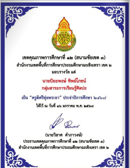 | 73 | นางสาวสุกฤตา รื่นเจริญ | ครู | วัดบางกระเจ็ด | คุรุชนคนคุณธรรม | อื่นๆ | เขตพื้นที่การศึกษา | 2567-10-09 | สำนักงานเขตพื้นที่การศึกษาประถมศึกษาฉะเชิงเทรา เขต 2 | เปิดไฟล์ |