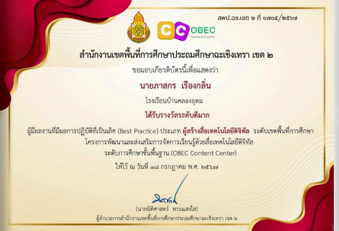 | 184 | นายแซ็กกฤษฏาพงษ์ สุดโกทา | ครู | บ้านคลองอุดม | รางวัลผลการปฏิบัติการที่เป็นเลิศ (Best Practice) ระดับดี ประเภทผู้สร้างสื่อเทคโนโลยีดิจิทัล (OBEC Content Center) ระดับเขตพื้นที่การศึกษา ประจำปี ๒๕๖๘ | อื่นๆ | เขตพื้นที่การศึกษา | 2025-07-23 | สำนักงานเขตพื้นที่การศึกษาประถมศึกษาฉะเชิงเทรา เขต ๒ | เปิดไฟล์ |