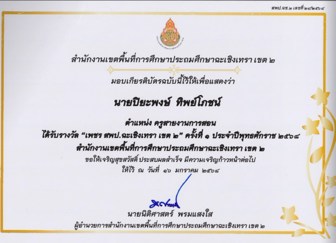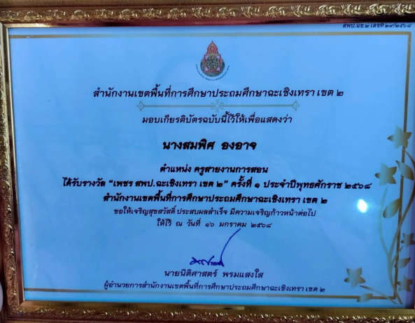 | 54 | นางสาวมนัญชยา เหลืองทอง | ครู | วัดสะแกงาม | ผู้มีส่วนร่วมในการส่งเสริม สนับสนุน พัฒนาสภาพสิ่วแวดล้มอและห้องเรียนที่มีคุณภาพและโดดเด่นเป็นไปตามแนวทางภารบริหารจัดการห้องเรียน (DLTV) | อื่นๆ | เขตพื้นที่การศึกษา | 2024-08-22 | สำนักงานเขตพื้นที่การศึกษาประถมศึกษาฉะเชิงเทรา เขต 2 | เปิดไฟล์ |