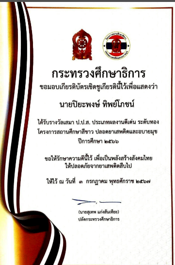 | 224 | นำโชค ภักดีหาร | ครู | บ้านเทพประทาน | เสมา ป.ป.ส. โครงการสถานศึกษาสีขาว ปลอดยาเสพติดและอบายมุข ปีการศึกษา 2566 | อื่นๆ | จังหวัด | 2024-06-28 | กระทรวงศึกษาธิการ | เปิดไฟล์ |