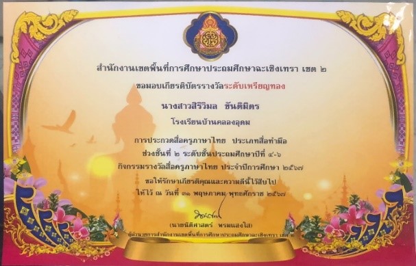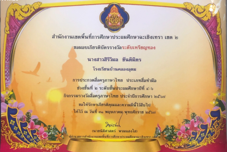 | 172 | นางงสาวสิริวิมล ขันติมิตร | ครู | บ้านคลองอุดม | รางวัล ระดับเหรียญทอง การประกวดสื่อครูภาษาไทย ประเภทสื่อทำมือ ช่วงชั้นที่ ๒ ระดับชั้นประถมศึกษาปีที่ ๔-๖ | อื่นๆ | เขตพื้นที่การศึกษา | 2024-05-31 | สำนักงานเขตพื้นที่การศึกษาประถมศึกษาฉะเชิงเทรา เขต ๒ | เปิดไฟล์ |