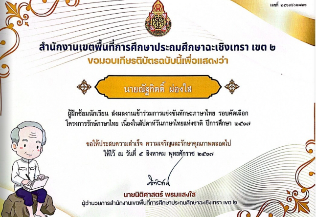 | 95 | นางสาวสุจิตรา ทิมศรี | ครู | วัดบางโรง | การ แข่งขันทักษะภาษาไทย รอบเขตพื้นที่การศึกษา โครงการรักษ์ภาษาไทย เนื่องในสัปดาห์ วันภาษาไทย ปีการศึกษา 2567 | อื่นๆ | เขตพื้นที่การศึกษา | 2025-08-05 | สำนักงานเขตพื้นที่ การศึกษาประถมศึกษาฉะเชิงเทรา เขต 2 | เปิดไฟล์ |