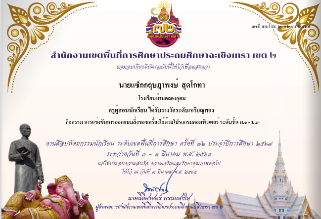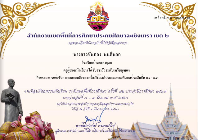 | 182 | นางสาวขันทอง นนตีนอก | ครู | บ้านคลองอุดม | ครูผู้สอนนักเรียน รางวัลระดับเหรียญทอง กิจกรรมการแข่งขันการออกแบบสิ่งของเครื่องใช้ด้วยโปรแกรมคอมพิวเตอร์ ระดับชั้น ม.๑-ม.๓ งานศิลปหัตถกรรมนักเรียน ระดับเขตพื้นที่การศึกษา ครั้งที่ ๗๒ | อื่นๆ | เขตพื้นที่การศึกษา | 2025-03-09 | สำนักงานเขตพื้นที่การศึกษาประถมศึกษาฉะเชิงเทรา เขต ๒ | เปิดไฟล์ |