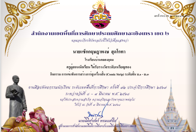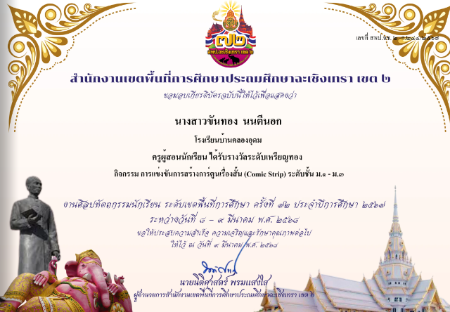 | 44 | นายกาญจน์ เอี่ยมอ่อง | ครู | วัดบึงกระจับ | ครูผู้สอนนักเรียน กิจกรรมการสร้างการ์ตูนเรื่องสั้น ระดับชั้น ป.4-6 งานศิลปหัตถกรรมนักเรียน ครั้งที่ 72 | รองชนะเลิศระดับเหรียญทอง | เขตพื้นที่การศึกษา | 2025-03-09 | สำนักงานเขตพื้นที่การศึกษาประถมศึกษาฉะเชิงเทรา เขต 2 | เปิดไฟล์ |