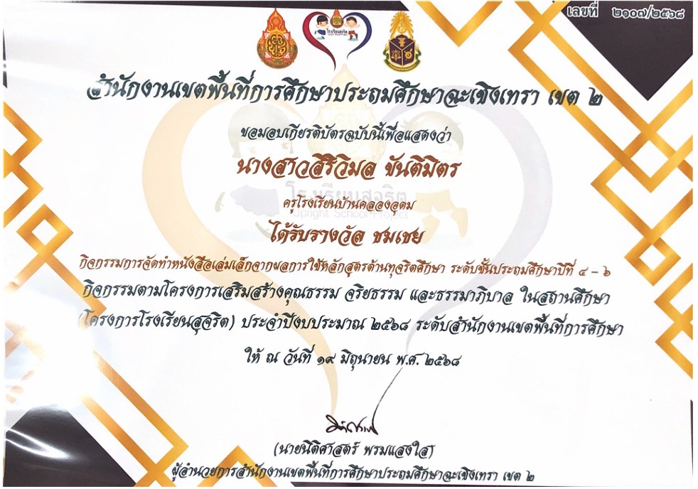 | 185 | นางสาวสิริวิมล ขันติมิตร | ครู | บ้านคลองอุดม | การจัดทำหนังสือเล่มเล็กจากผลการใช้หลักสูตรต้านทุจริตศึกษา ระดับชั้นประถมศึกษาปีที่ ๔-๖ | ชมเชย | เขตพื้นที่การศึกษา | 2025-06-19 | สำนักงานเขตพื้นที่การศึกษาประถมศึกษาฉะเชิงเทรา เขต ๒ | เปิดไฟล์ |