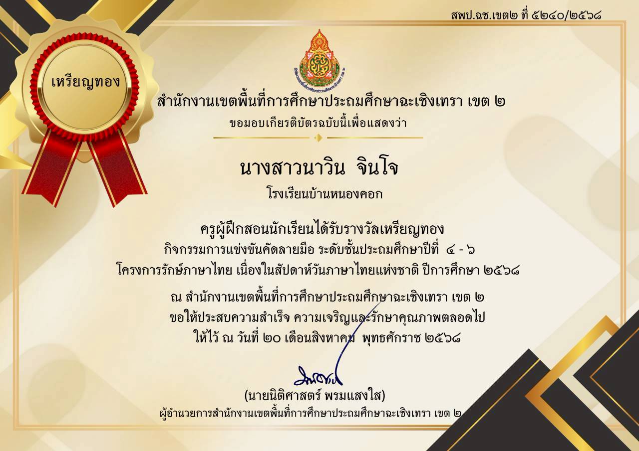 | 259 | นางสาวนาวิน จินโจ | ครู | บ้านหนองคอก | ครูผู้ฝึกสอนนักเรียนได้รับรางวัลเหรียญทอง กิจกรรมการแข่งขันคัดลายมือ ระดับชั้นประถมศึกษาปีที่ 4-6 โครงการรักษ์ภาษาไทย เนื่องในสัปดาห์วันภาษาไทยแห่งชาติ ปีการศึกษา 2568 | ชนะเลิศ | เขตพื้นที่การศึกษา | 2025-09-20 | สำนักงานเขตพื้นที่การศึกษาประถมศึกษาฉะเชิงเทรา เขต 2 | เปิดไฟล์ |