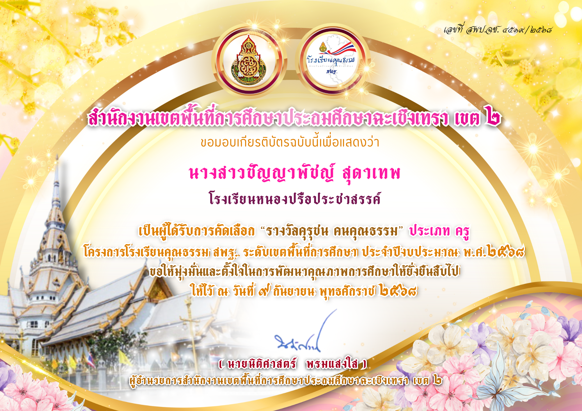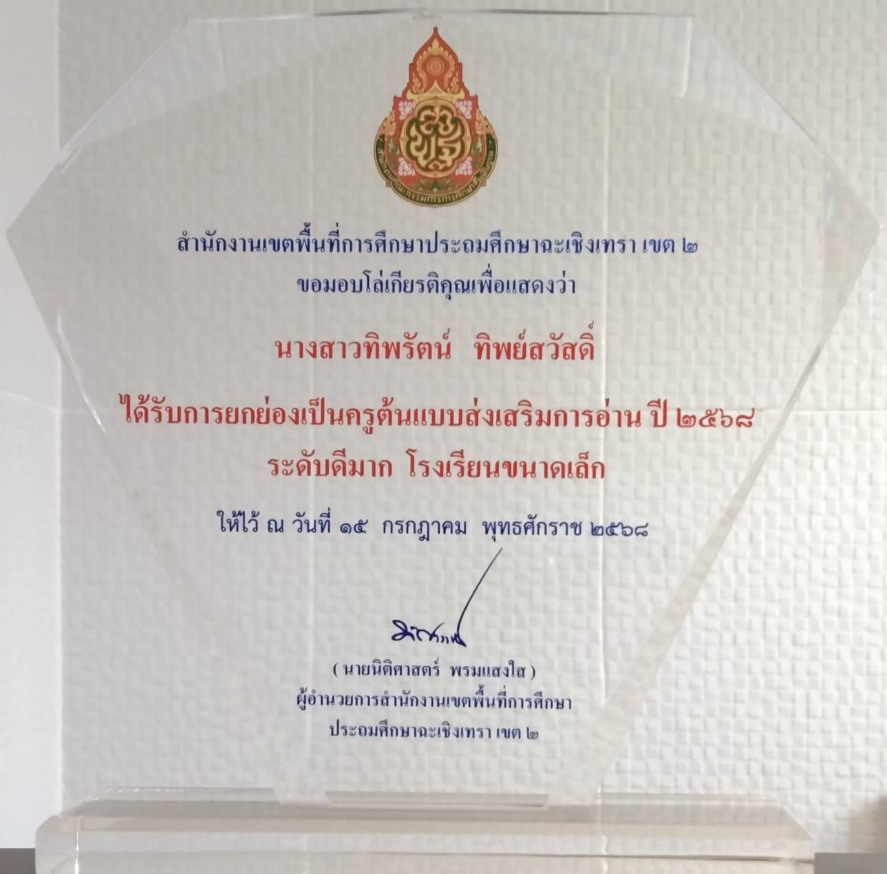 | 7 | นางสาวศุภรดา รักเกียรติเผ่า | ครู | วัดโคกหัวข้าว | รางวัลคุรุชน คนคุณธรรม ประเภทครู โครงการโรงเรียนคุณธรรม สพฐ. | อื่นๆ | จังหวัด | 2025-09-09 | สำนักงานเขตพื้นที่การศึกษาประถมศึกษาฉะเชิงเทรา เขต 2 | เปิดไฟล์ |