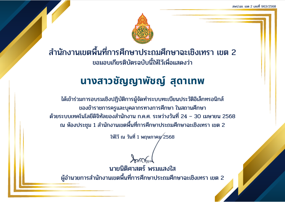 | 187 | นางสาวชัญญาพัชญ์ สุดาเทพ | ครู | หนองปรือประชาสรรค์ | อบรมเชิงปฏิบัติการผู้จัดทำระบบทะเบียนประวัติอิเล็กทรอนิกส์ของข้าราชการครูและบุคลากรทางการศึกษาในสถานศึกษาด้วยระบบเทคโนโลยีดิจิทัลของสำนักงาน กคศ. | อื่นๆ | ระดับเขตคุณภาพการศึกษา | 2025-04-30 | สำนักงานเขตพื้นที่การศึกษาฉะเชิงเทรา เขต 2 | เปิดไฟล์ |