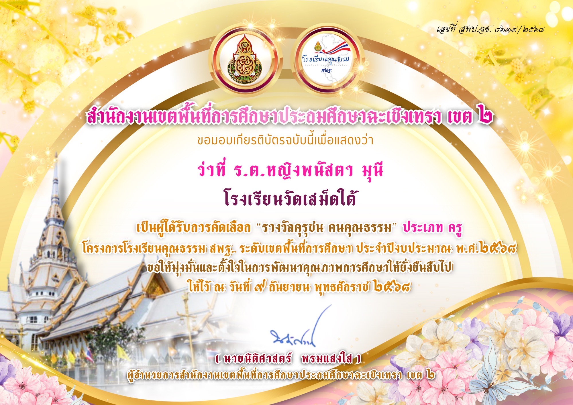 | 59 | ว่าที่ร้อยตรีหญิงพนัสตา มุนี | ครู | วัดเสม็ดใต้ | รางวัลคุรุชน คนคุณธรรม | อื่นๆ | ระดับเขตคุณภาพการศึกษา | 2025-09-09 | สำนักเขตพื้นที่การศึกษาประถมศึกษาฉะเชิงเทรา เขต 2 | เปิดไฟล์ |